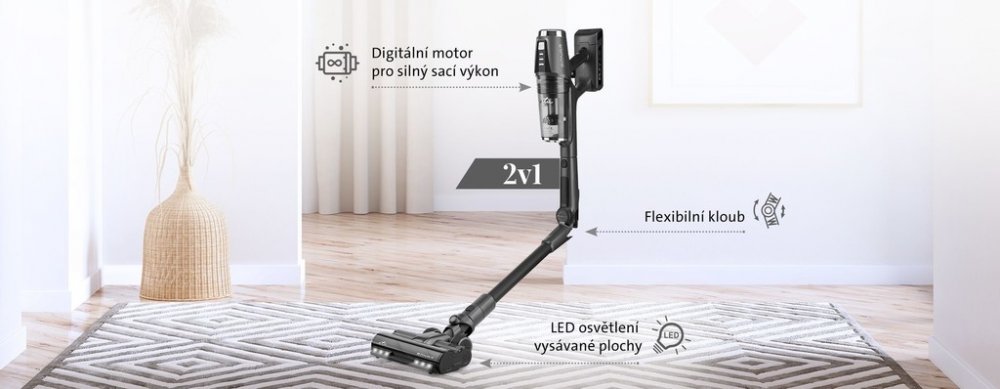 Tyčový vysavač 2 v 1 s digitálním motorem, rotačním turbokartáčem, flexibilním kloubem a 25,2V Li-ion akumulátorem.