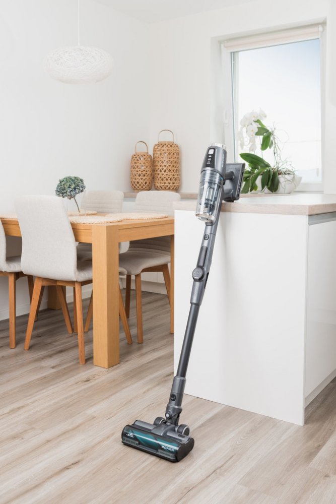 O efektivní úklid s výdrží až 40 minut na jedno nabití se postará snadno vyměnitelný 25,2V Li-ion akumulátor. Výdrž baterie závisí na nastaveném výkonu. Stav baterie a výkonu můžete přehledně sledovat na LED displeji. V případě, že se baterie úplně vybije, její opětovné nabití pak trvá 4-6 hodin. Baterii můžete snadno vyjmout a v případě potřeby dokoupit náhradní.