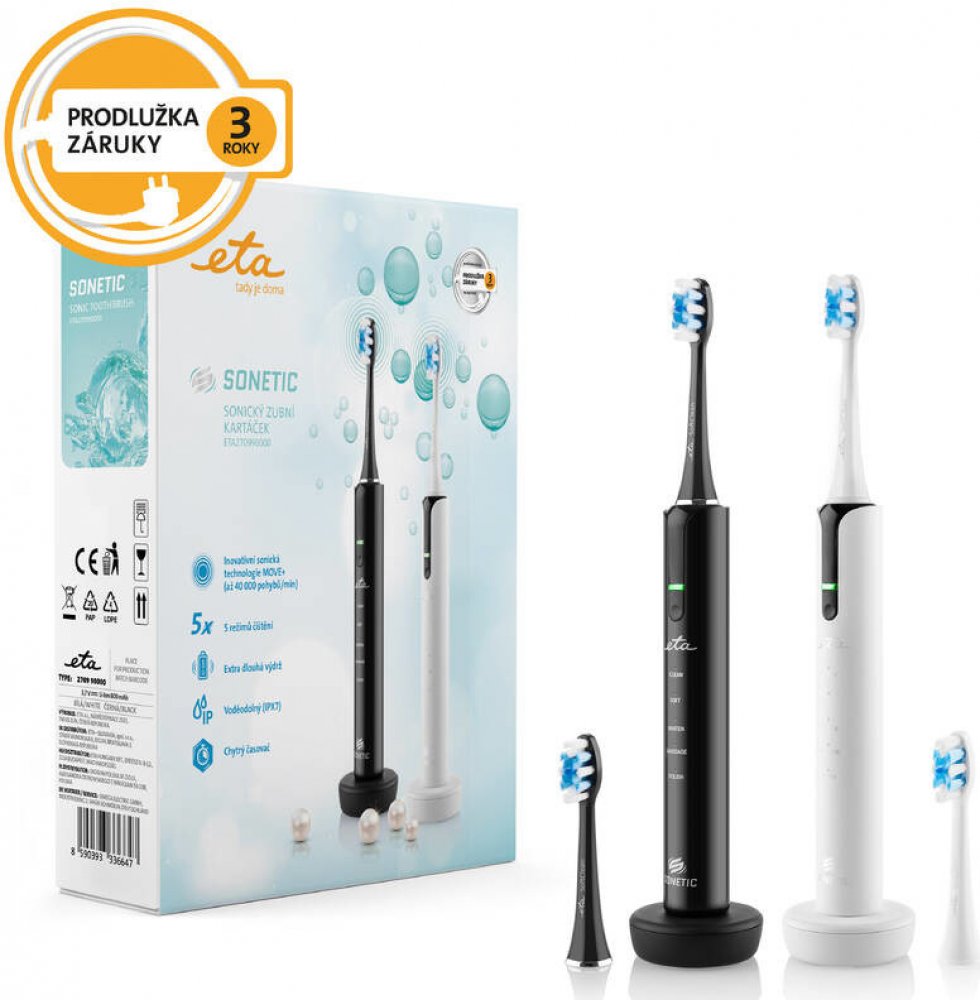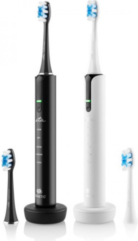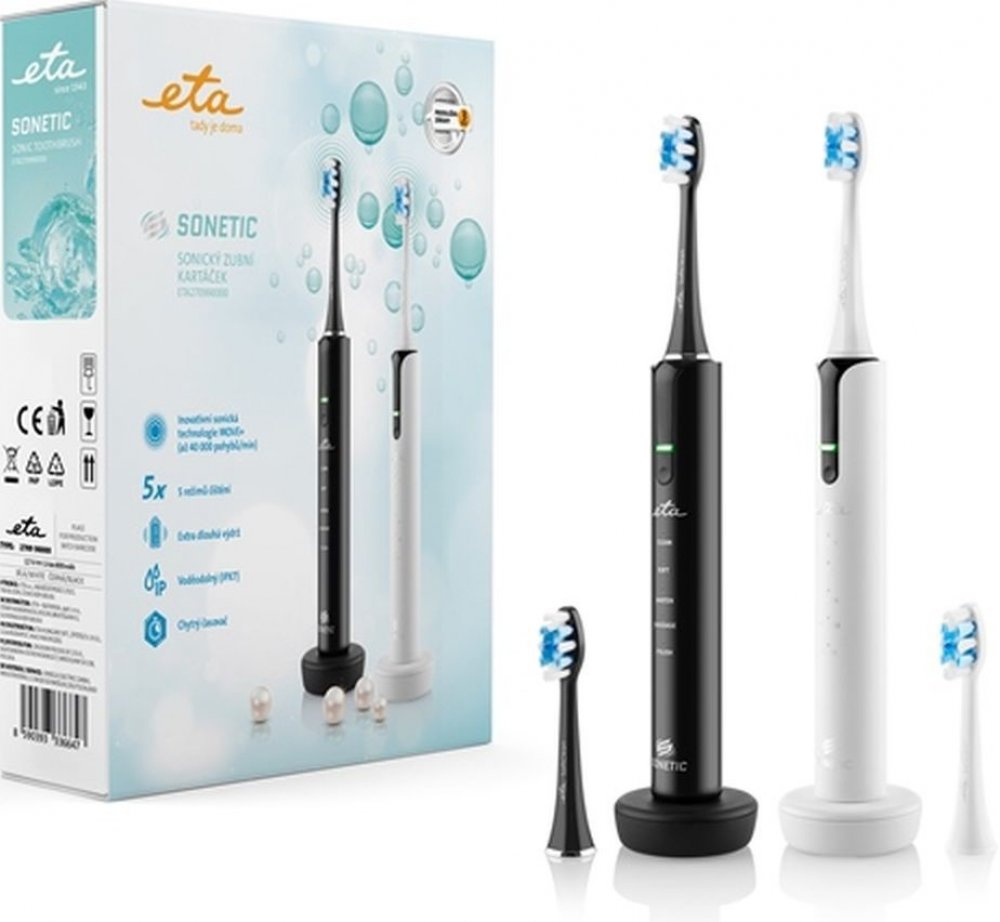 S elegantním setem zubních kartáčků ETA Sonetic, můžete získat pocit čistoty a svěžesti po celý den. Sonickou technologií MOVE+ šetrně čistí zuby i dásně, a to rychlostí až 40 000 pohybů za minutu. Účinně tak odstraňuje zubní plak a nečistoty i na místech, kam se běžný zubní kartáče nedostane. Kartáček je pro vás vhodný i pokud máte fixní rovnátka, fazety, korunky apod.