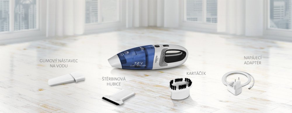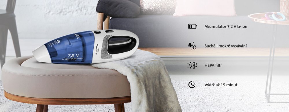 Ruční vysavač pro suché i mokré vysávání s kvalitním HEPA filtrem a Li-ion akumulátorem 7,2 V s výdrží až 15 minut.