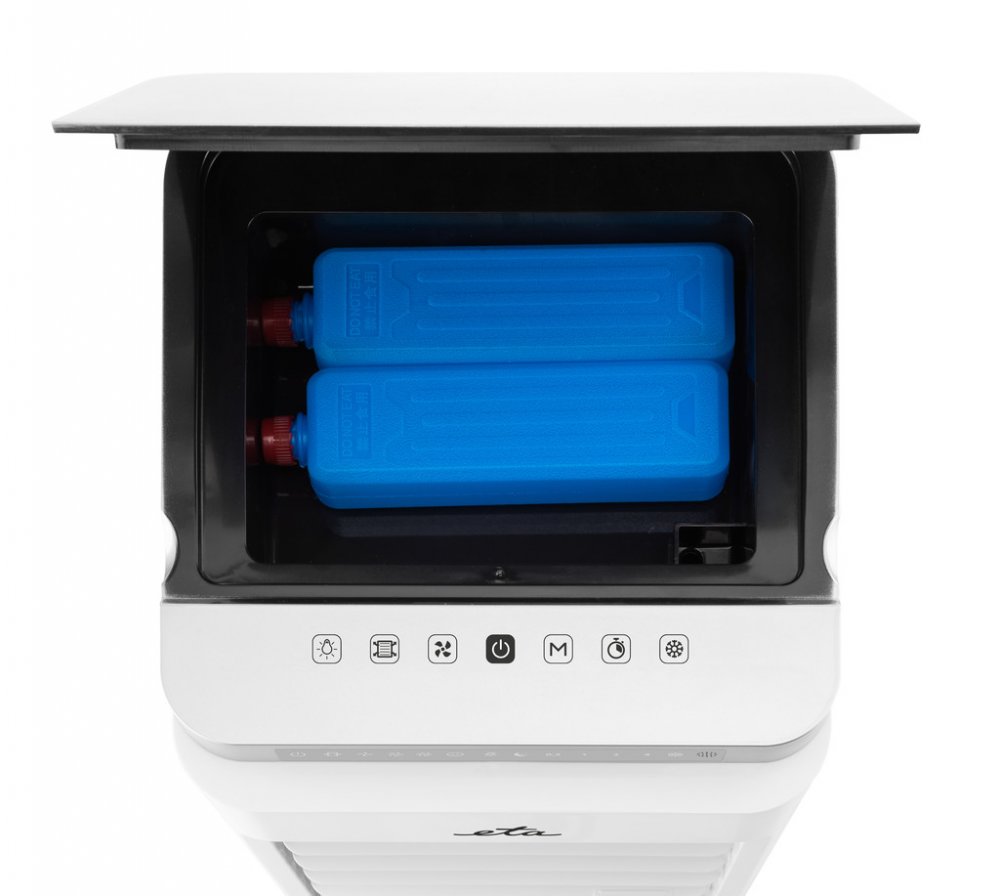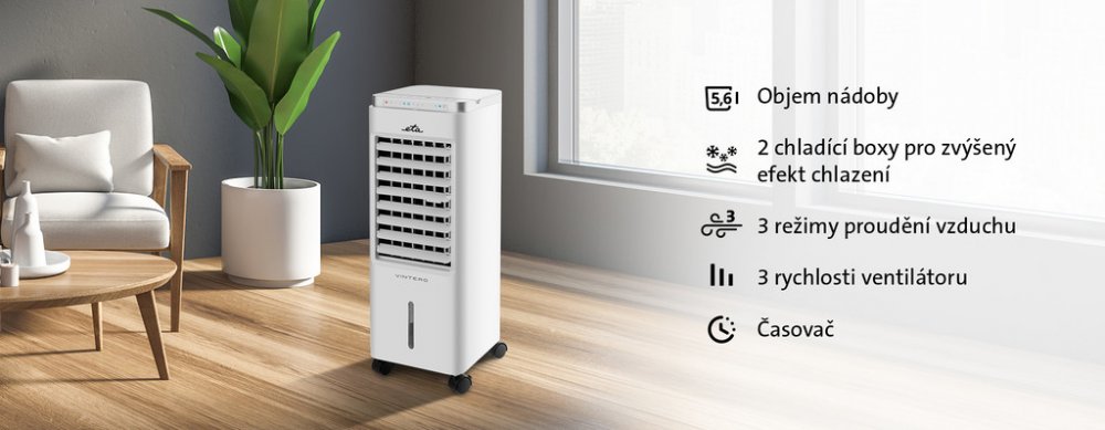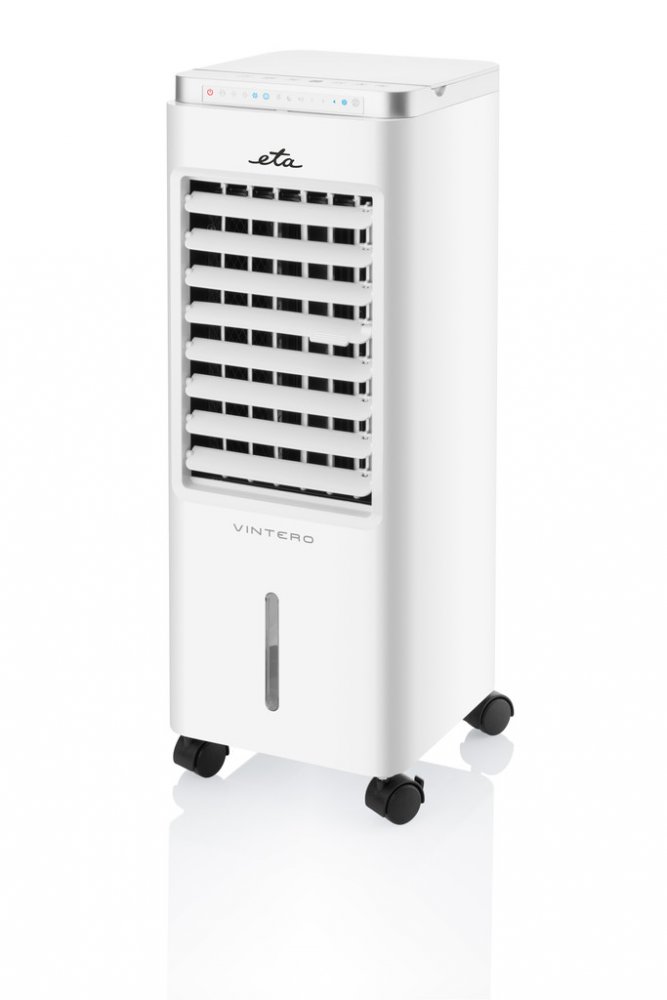 Pokud nejste fanoušky přidané chemie, ETA Vintero vás určitě zaujme. Funguje na principu odpařování vody ze zásobníku, do kterého můžete v opravdu horkých dnech vložit chladicí boxy nebo přidat kousky ledu. Odnímatelná transparentní nádoba s velkorysým objemem 5,6 l disponuje přehledným ukazatelem vody a na jedno naplnění nabízí až 6 hodin nepřetržitého chlazení.