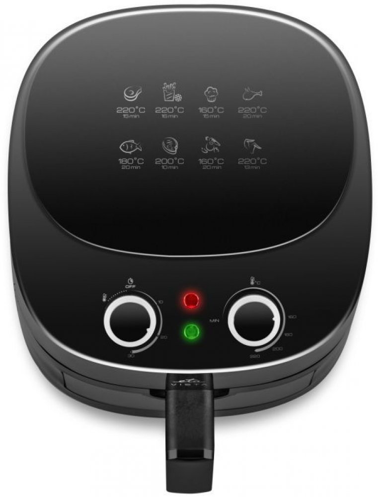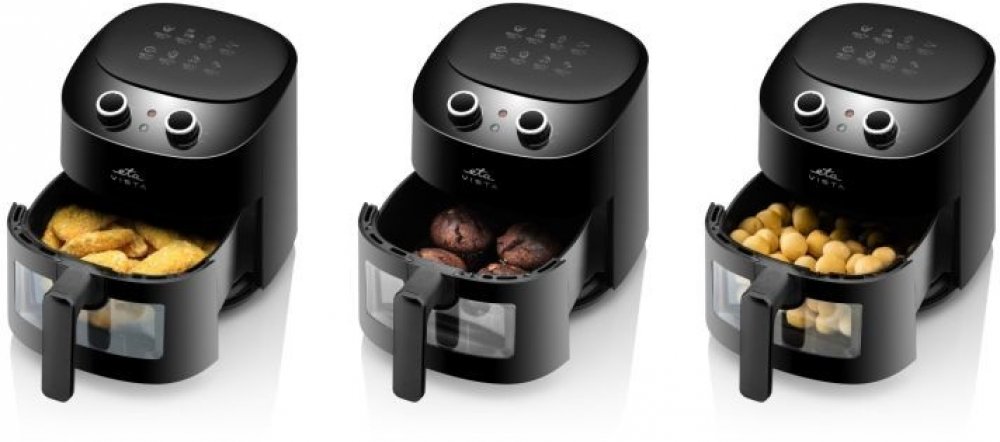 Připravte si oblíbená smažená i nesmažená jídla s ve zdravější verzi, s minimem přidaného tuku! Horkovzdušná fritéza ETA Vista smaží jídlo pomocí horkého vzduchu, který proudí rovnoměrně uvnitř fritézy. Výsledkem jsou pak rovnoměrně usmažené řízky, hranolky, krokety i zeleninový falafel.