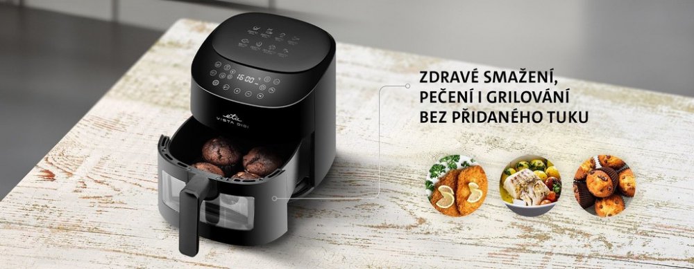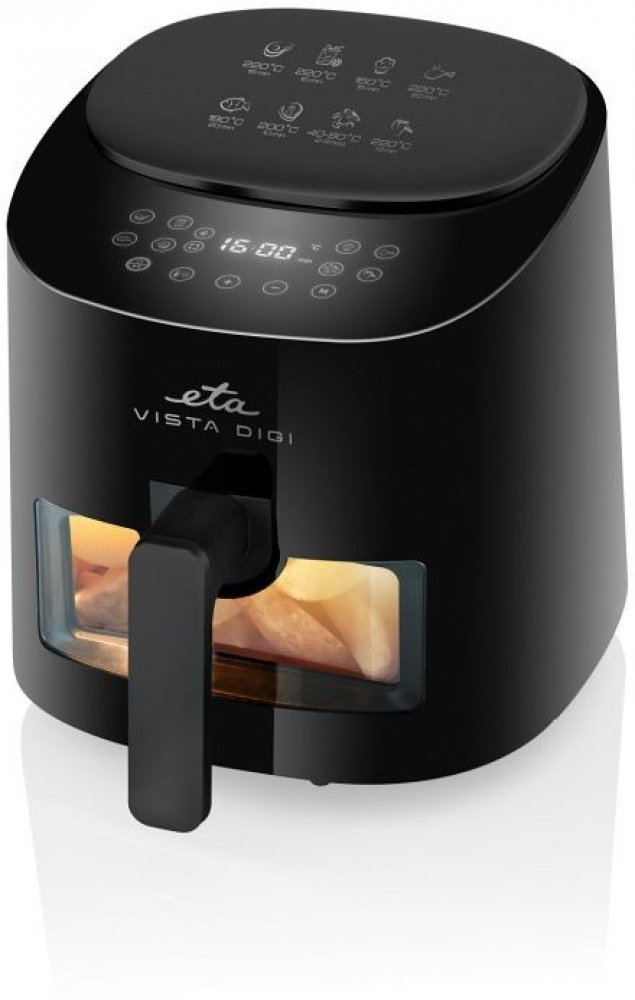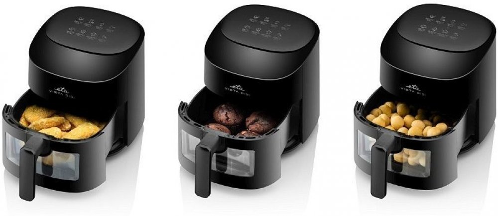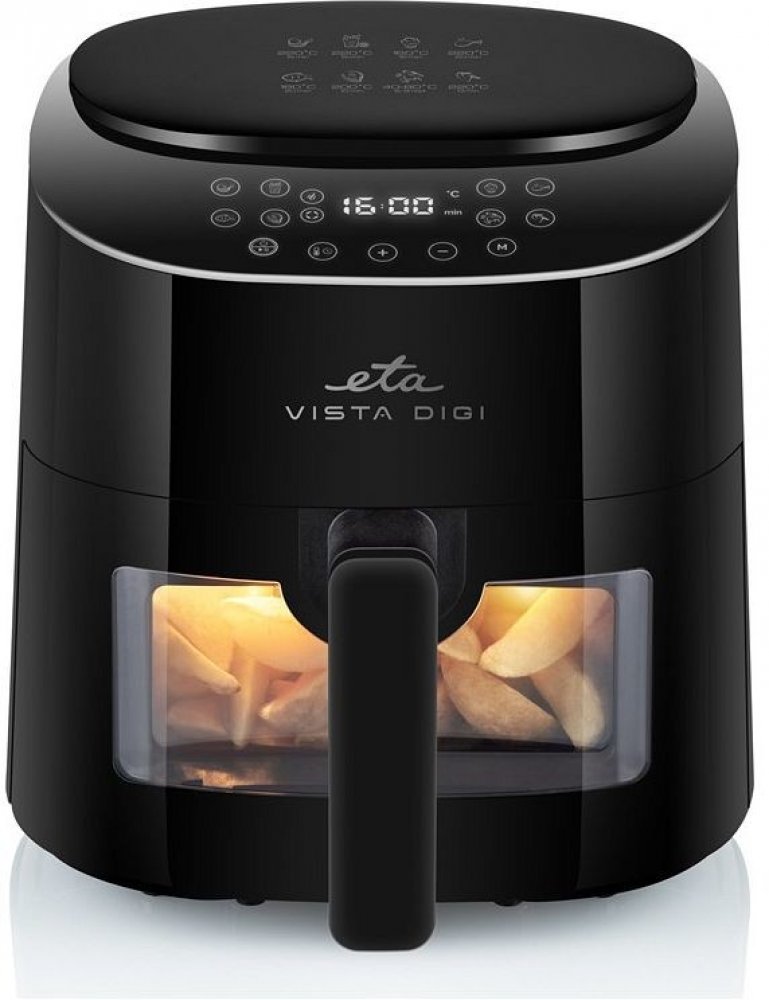 Horkovzdušná fritéza ETA Vista Digi vám umožní zdravě vařit a péct vaše oblíbené pochutiny. S její pomocí si připravíte hranolky, řízky, krokety, zeleninový falafel, dortové korpusy, muffiny a další pokrmy s použitím minimálního množství tuku. Spotřebič se vyrábí ze zdravotně nezávadných materiálů. S celou rodinou si pochutnáte na vynikajícím a lehčím jídle z fritézy.
