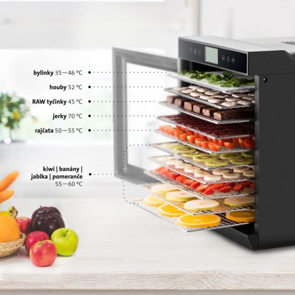 * Elektronický termostat zajišťuje žádoucí výkyvy teploty, při kterých dochází k optimálnímu a rychlému odstraňování vlhkosti z potravin