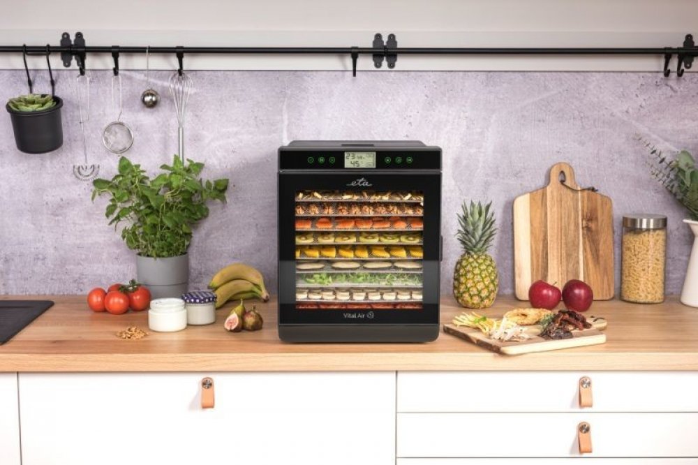 Sušička potravin ETA Vital Air II otevírá dveře do světa výroby poctivých domácích pochoutek. Poradí si se sušením veškerého ovoce, zeleniny i hub, a dokonce i masa nebo ryb (domácí „jerky“). Šetrně nasuší i bylinky a domácí koření.