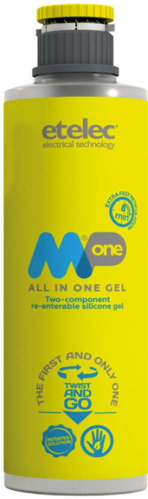 Dvousložkový zalévací gel - ETELEC MPone. Pro výplň a izolaci elektrických spojů. Rychle a jednoduše chrání spoj před nepříznivými přírodními vlivy jako je vlhkost, prach a další nečistoty. Složky gelu "A" i složka gelu "B" jsou obsaženy v jedné láhvy. Po smíchání obou složek gelu je výsledná hmota průhledná s nízkou viskozitou a po vytuhnutí zůstává po celou dobu životnosti spoje rosolovitá. Při samotném vylévání krabičky nebo jiného média krásně zatéká do všech zákoutí. Spoj lze po vytuhnutí jednoduše rozebrat. Gel je šetrný k životnímu prostředí. Navíc nemá žadnou expiraci - můžete jej uchovávat/skladovat mít jej k použití kdykoliv bude potřeba. Dielektrická pevnost 25,5 kV/mm.Technické parametry: Celkový objem gelu v balení: 0,9 litru = 0,9 dm3 = 0,0009 m3