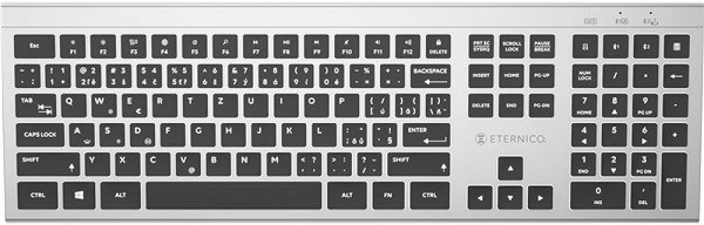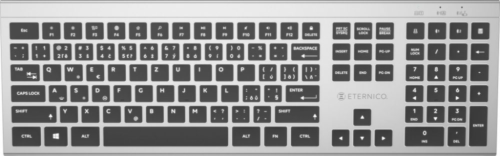 Klávesnice - bezdrátová, supertenká, do kanceláře i domácnosti, 7 režimů LED podsvícení, numerická klávesnice, nízkoprofilové klávesy, technologie power saving, multimediální klávesy, připojení přes USB receiver nebo 2 Bluetooth profily, dobíjení přes USB-C, česká a slovenská lokalizace kláves