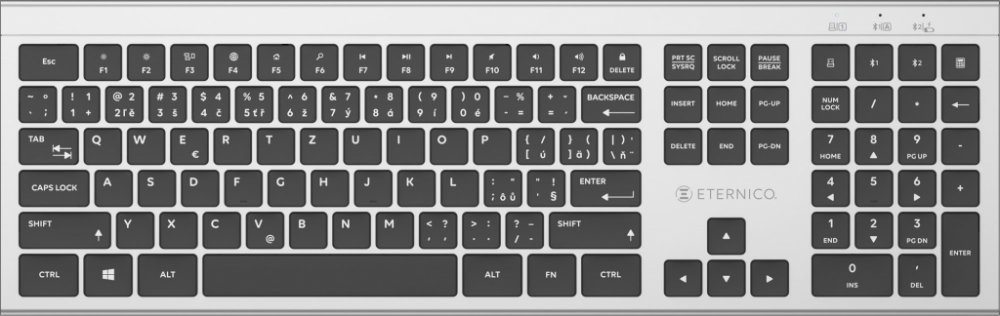bezdrátová, supertenká, do kanceláře i domácnosti, numerická klávesnice, nízkoprofilové klávesy, technologie power saving, multimediální klávesy, připojení přes USB receiver nebo 2 Bluetooth profily, napájení 2× AAA baterie, česká a slovenská lokalizace kláves (AET-KSB3002CSS)