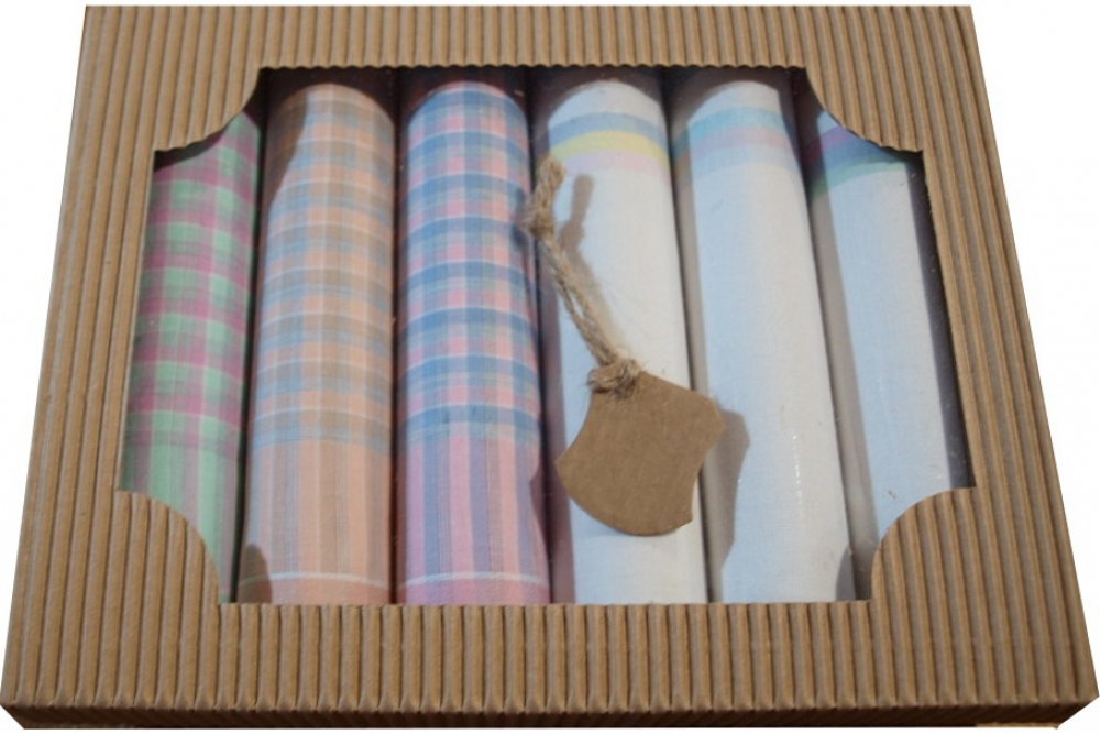 Dámské kapesníky klasické české výroby jsou balené v dárkové papírové krabičce a vyrobené ze 100% česané bavlny. Balení obsahuje 6 ks. Kapesníky jsou klasické dámské velikosti cca 30cm x 30cm. Rozměr krabičky 22 x 16 x 4 cm.