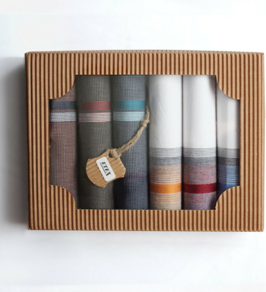 Bavlněné pánské kapesníky, ručně složené v praktické ekologické krabičce s průhledným víkem, jsou v sadě po šesti kusech.