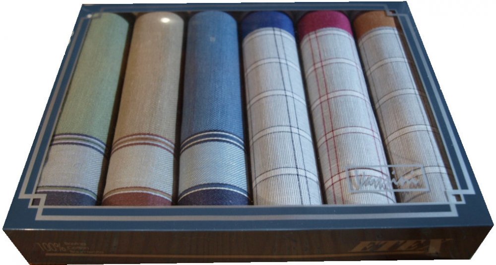 Kvalitní bavlněné kapesníky balené po šesti kusech v krabičce. Kapesníky jsou vyrobeny z česané bavlny, rozměr kapesníků je klasický cca 40x40cm.