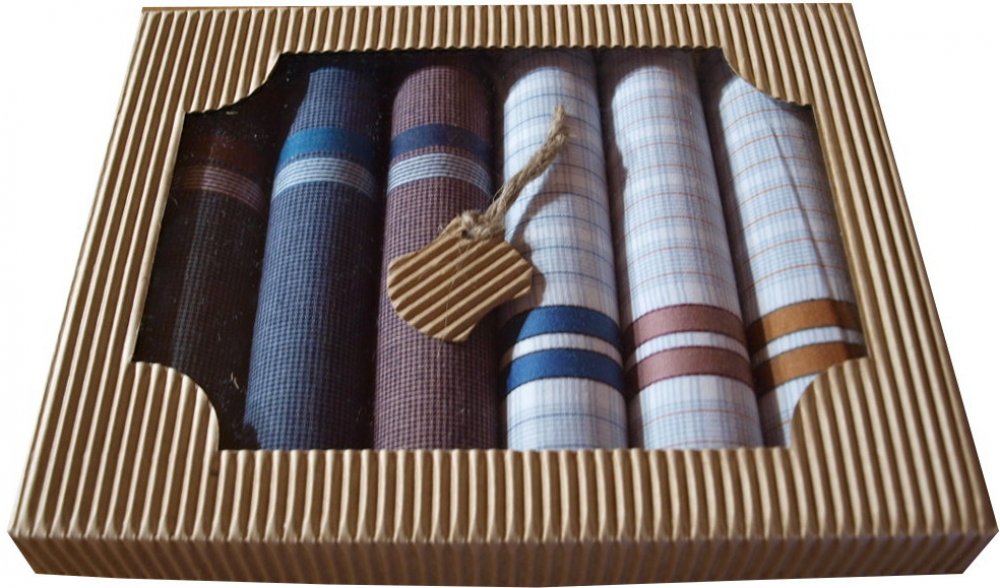 Pánské kapesníky klasické české výroby jsou balené v dárkové krabičce. Balení obsahuje 6 ks. Kapesníky jsou klasické pánské velikosti cca 40cm x 40cm.
