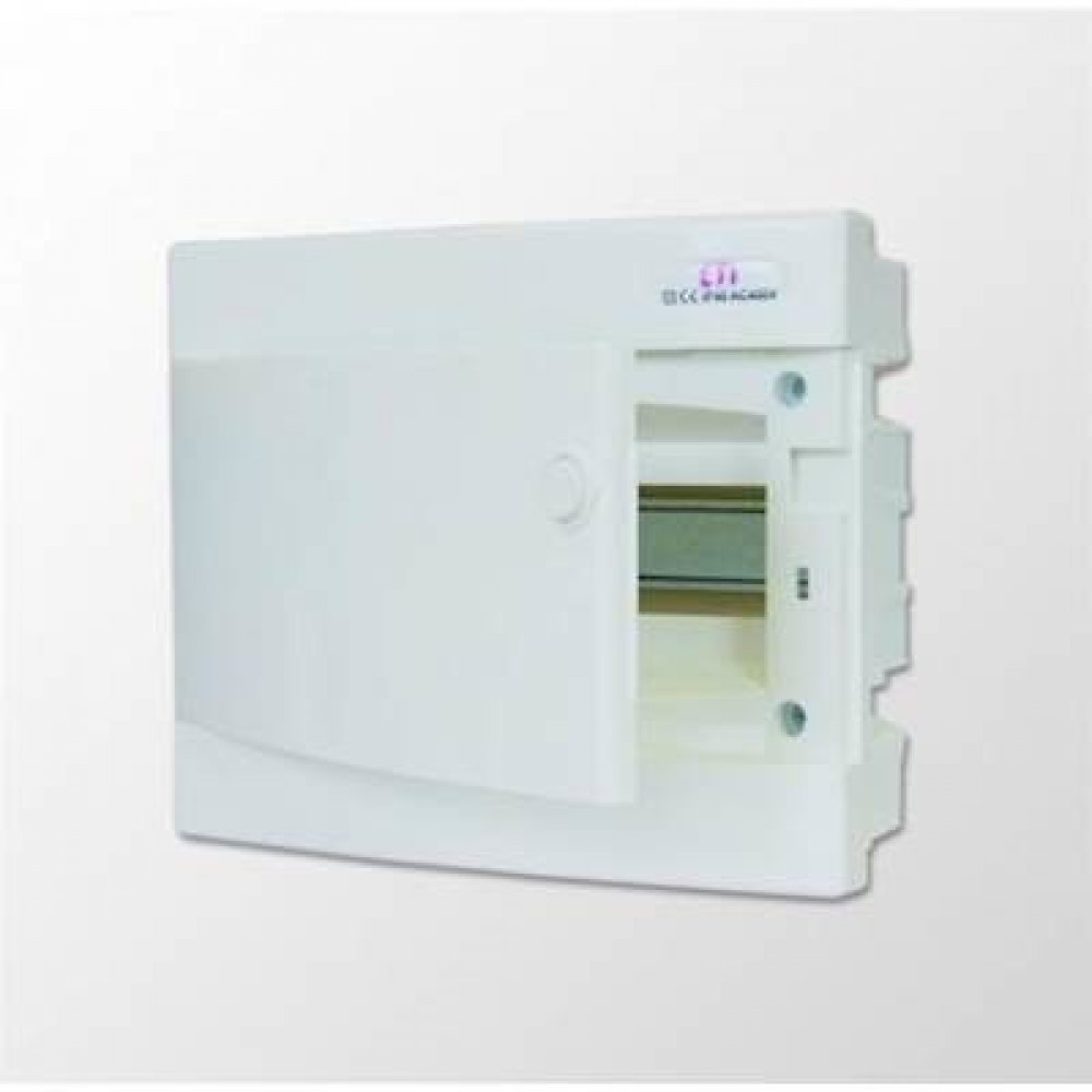 Plastová rozvodnice pro domovní elektroinstalace s bílými dvířky, určena pro vnitřní použití.