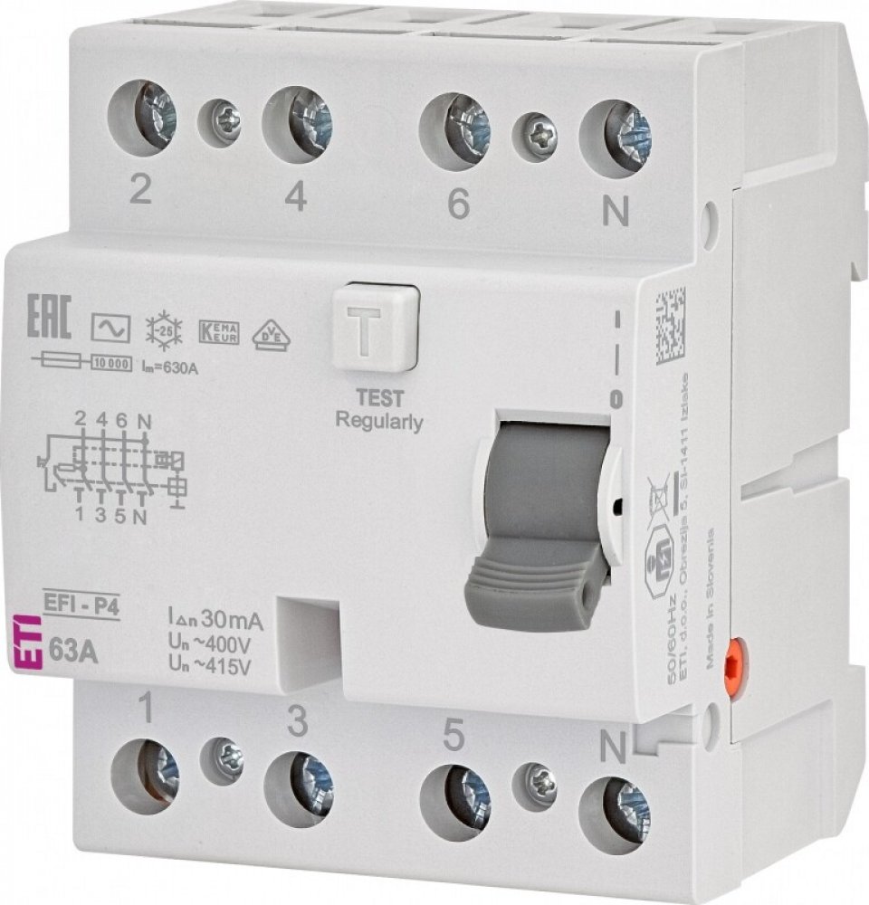 Proudový chránič ETI EFI-P4 AC 63/0,03 je určen pro ochranu osob před úrazem elektrickým proudem a pro prevenci požárů způsobených unikajícím proudem. Vhodný pro sítě TN-S, TN-C-S, TT a IT. Typ AC reaguje na střídavé sinusové proudy. Nabízí vysokou spolehlivost, rychlou reakci a montáž na DIN lištu. Ideální pro bytové, komerční i průmyslové aplikace.✅ Technické parametry