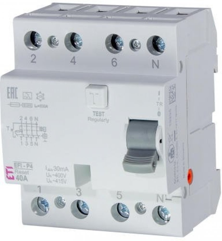 Proudové chrániče EFI se používají pro všechny systémy, které mají oddělené neutrální a ochranné vodiče, tj. TN-S, TN-CS, TT a IT síťové systémy. Mají štítek kvality testované spolehlivosti a jsou dodávány s jednofázovými nebo trojfázovými přípojnicemi.Proudový chránič je určen pro montáž na DIN lištu 35 mm dle EN60715 (EN50022).Pro jmenovité proudy do 63 A se použijí pojistkové vložky s charakteristikou gG a jmenovitý proud 63 A. Pro jmenovitý proud 80 A se použijí pojistkové vložky s gG charakteristikou a proud 80 A.Technické parametry: Jmenovitý proud: 40 A Reziduální proud: 300 mA Počet pólů: 4 Zkratová vypínací schopnost: 10 kA