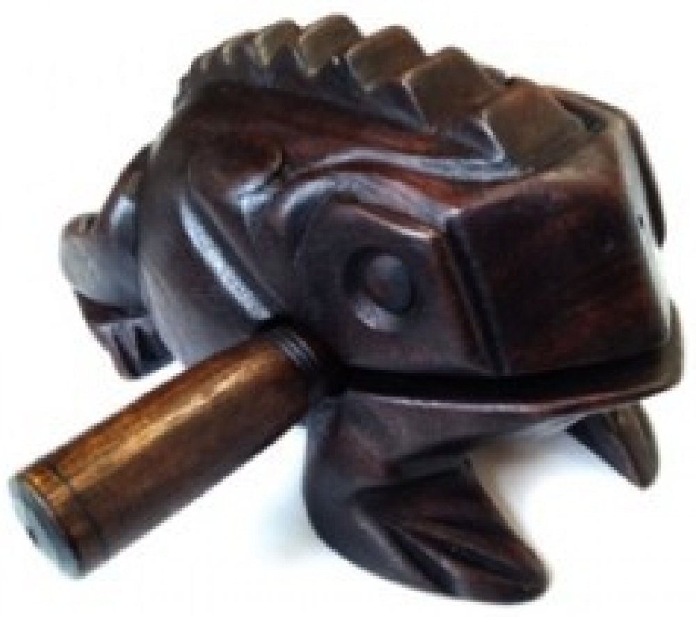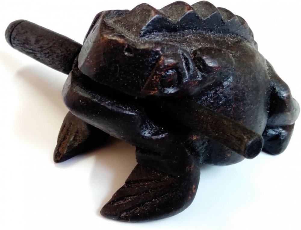 Etno guiro žabák S Guiro žabák S - malý. Guiro je původem jihoamerický perkusní nástroj. Hraje se třením hůlky o hroty zářezů. Guiro je běžně používán ve formách latinskoamerické hudby a hraje klíčovou roli v typické rytmické sekci. Vlastnosti: Guiro Tvar žába Materiál: dřevo Velikost: S