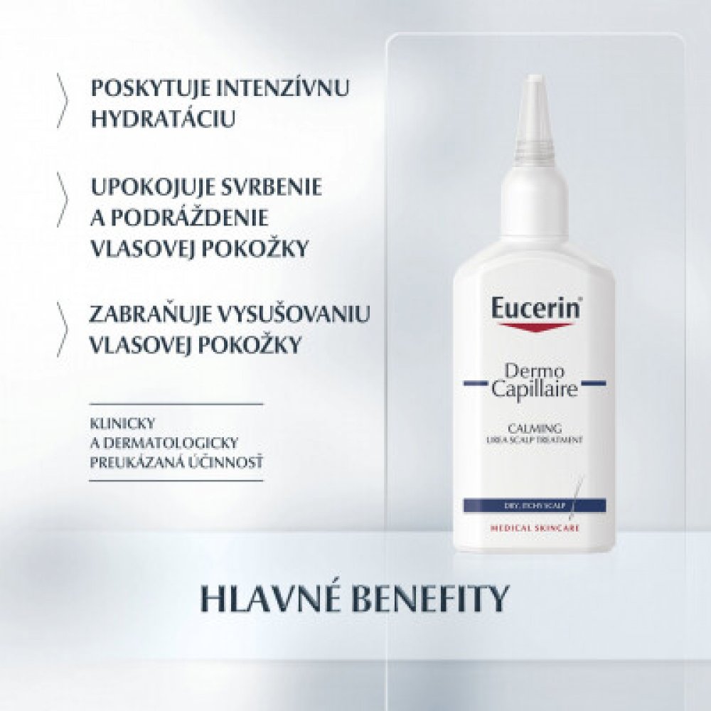 Eucerin DermoCapillaire Zklidňující tonikum s ureou bylo vyvinuto speciálně pro suchou a svědící vlasovou pokožku. Jeho nelepkavé bezoplachové složení je obohaceno o ureu a laktát – dvě z hydratačních látek, které si zdravá pokožka přirozeně vytváří. Přináší vaší vlasové pokožce intenzivní hydrataci pro obnovu její přirozené hydratační rovnováhy a zmírnění mikrozánětů. Obsahuje také licochalcon A a polidokanol, které pomáhají zmírňovat a uklidňovat svědění a podráždění již od prvního použití.