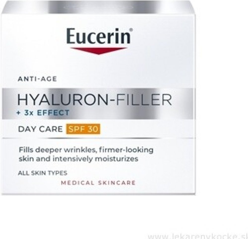 Eucerin HYALURON-FILLER+3xEFFECT Denní krém SPF30 je moderní pleťový krém proti vráskám určený pro všechny typy pleti. Kombinuje intenzivní hydrataci, účinnou péči proti stárnutí a ochranu před slunečním zářením. Díky obsahu kyseliny hyaluronové a speciálnímu antioxidantu glycin saponinu dokáže vyplňovat jemné i hlubší vrásky, zpevňovat pleť a navrátit její mladistvý vzhled.