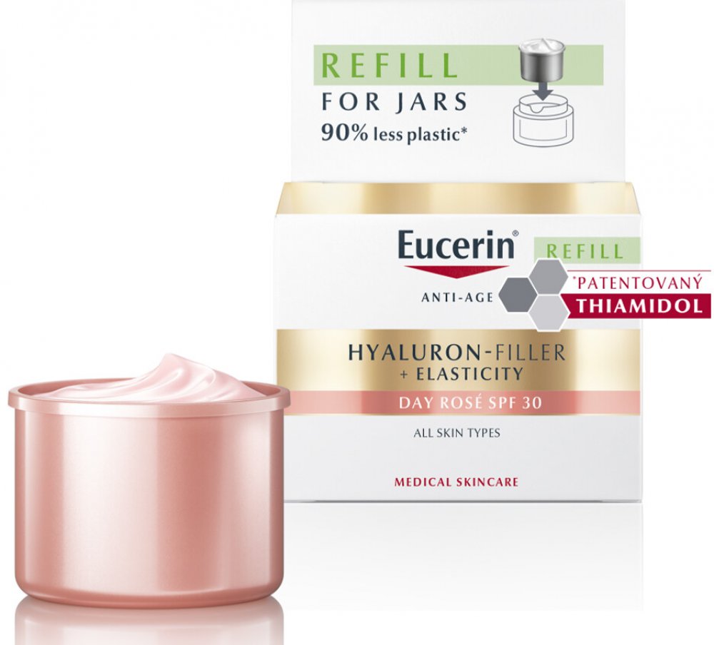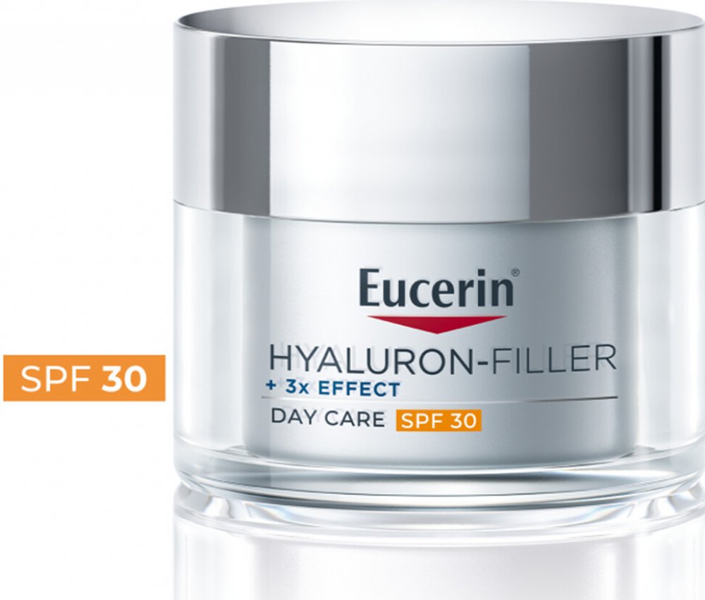 Eucerin Hyaluron-Filler + Elasticity Denní krém SPF 30 s SPF 30 a filtrem UVA poskytuje účinnou ochranu před fotostárnutím a prohlubováním vrásek.