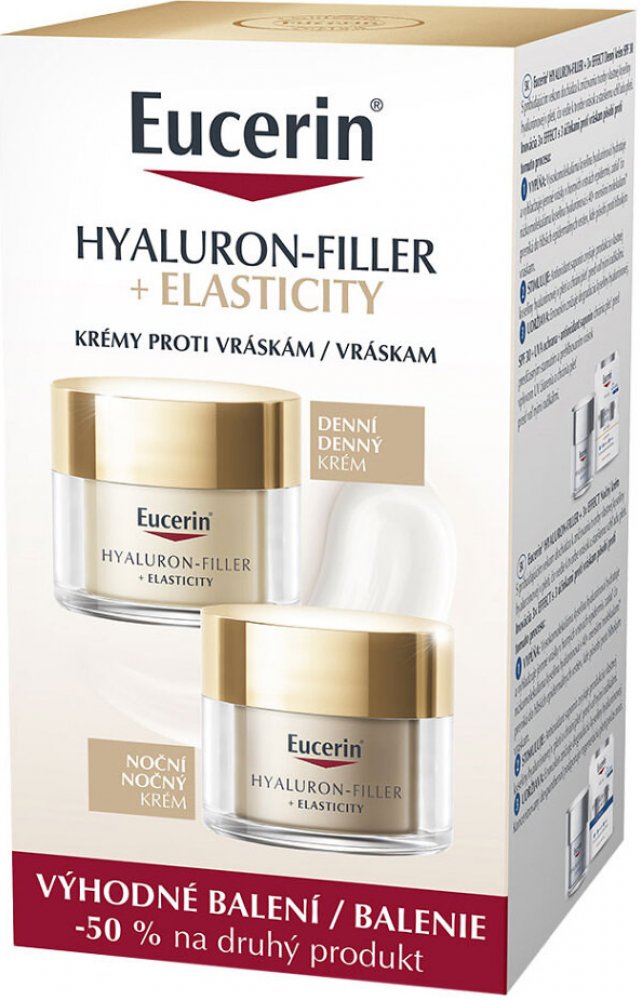 Eucerin Hyaluron-filler + Elasticity Denní krém + Noční krém 2 x 30 ml Denní krém SPF 15 vyplňuje hluboké vrásky, zlepšuje pružnost pleti a redukuje pigmentové skvrny. Speciálně vyvinutý pro zmírnění pokročilých známek stárnutí. Noční krém vyplňuje hluboké vrásky, zlepšuje pružnost pleti a redukuje pigmentové skvrny.