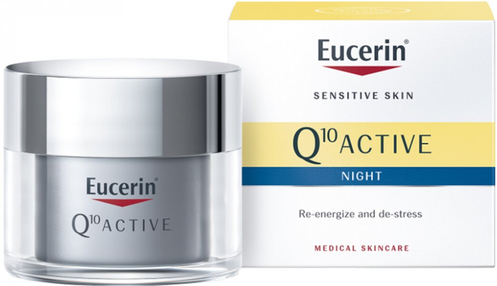 Eucerin Q10 Active. Noční pleťový krém Eucerin Q10 Active. Noční pleťový krém Eucerin Q10 Active účinně vyhlazuje pleť. Při pravidelném používání viditelně redukuje vrásky i jemné linky. Pleť bude opět svěží, pevnější a hladší. Použití: Aplikujte večer na čistou pleť.