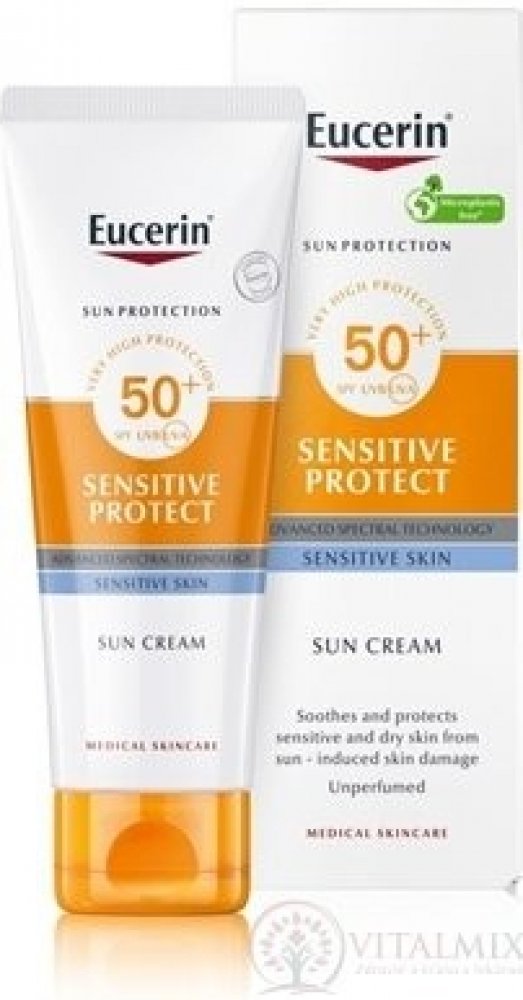 Eucerin Sun Sensitive Protect, 50 ml, Přípravky před opalováním pro ženy, Chraňte svou kůži před předčasným stárnutím i jiným poškozením způsobeným slunečním zářením. Opalovací přípravek Eucerin Sun Sensitive Protect vystaví účinný obranný štít paprskům UV záření a pomůže vám tak předcházet nejen spálení, ale i vzniku pigmentových skvrn, snížení kožní pružnosti, úbytku kolagenu a dalším projevům s...