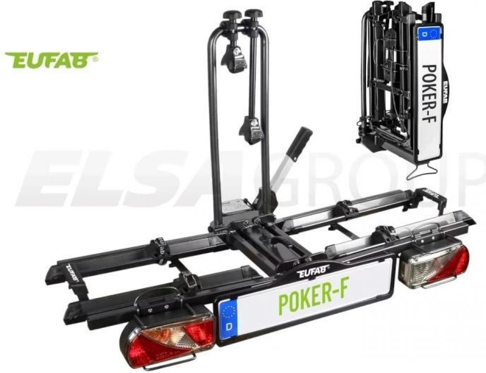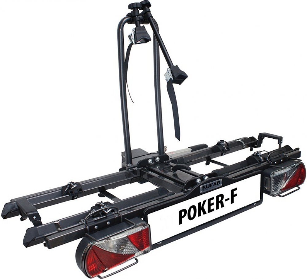 Kvalitní nosič jízdních kol Poker-F značky Eufab s váhou 18 kg je vhodný pro přepravu 2 kol či elektrokol. Díky rychloupínání lze nosič rychle a spolehlivě připevnit k tažnému zařízení, následné upnutí jízdních kol k rámu držáku je za pomoci pevných textilních pásů. Integrovaná sklopná funkce umožňuje snadný přístup do zavazadlových prostor. Nosič je předmontován, čímž se eliminuje zdlouhavá příprava k použití, je také složen v praktické tašce pro pohodlný transport či snadné uložení. K flexibilnímu přizpůsobení držáku jízdnímu kolu je možné individuální nastavení kolejnice i rámu držáku. V případě, že nosič zrovna nepotřebujete, můžete jej velmi prostorově úsporným způsobem složit.