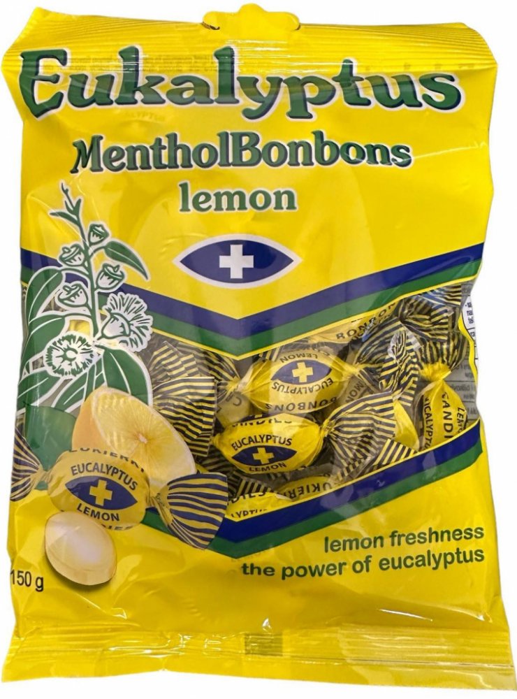 Tvrdé karamely s eukalyptovou a citronovou příchutí.