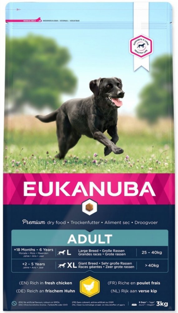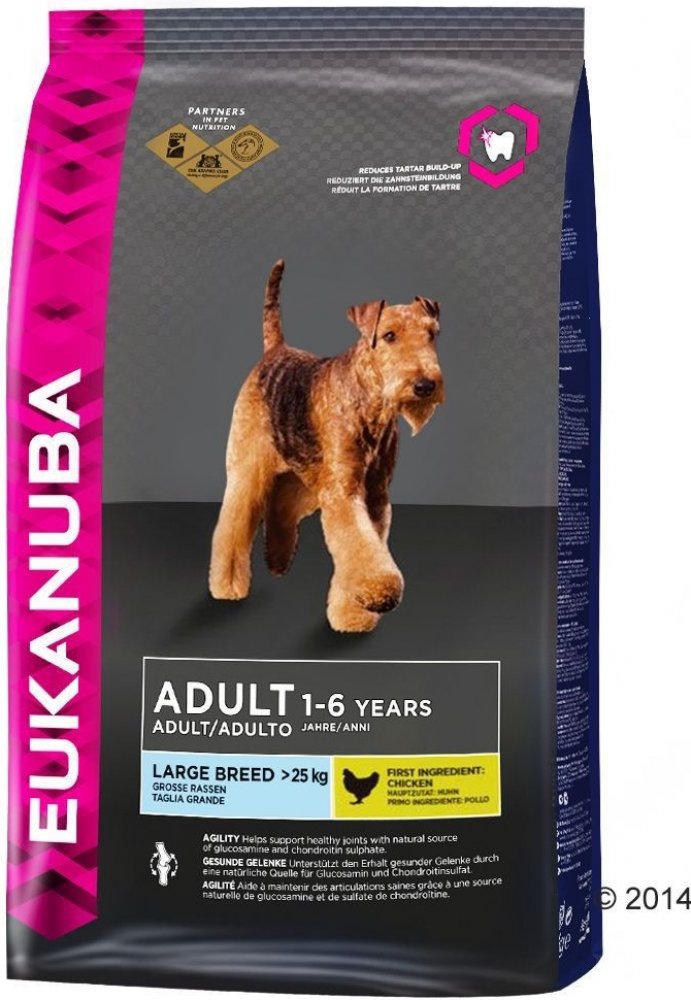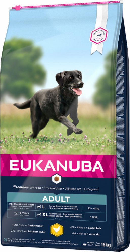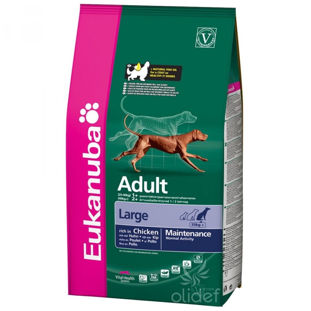 Kompletní superprémiové krmivo pro dospělé psy velkých a obřích plemen. Krmivo Adult Large vyhovuje psům, kteří nemají zdravotní komplikace, ale i těm, které trápí citlivé klouby. Granule Eukanuba Adult Large je ideální jako prevence celkového zdraví. Obsahuje krůtí a kuřecí maso. Obsahuje kukuřici a vybrané obiloviny.