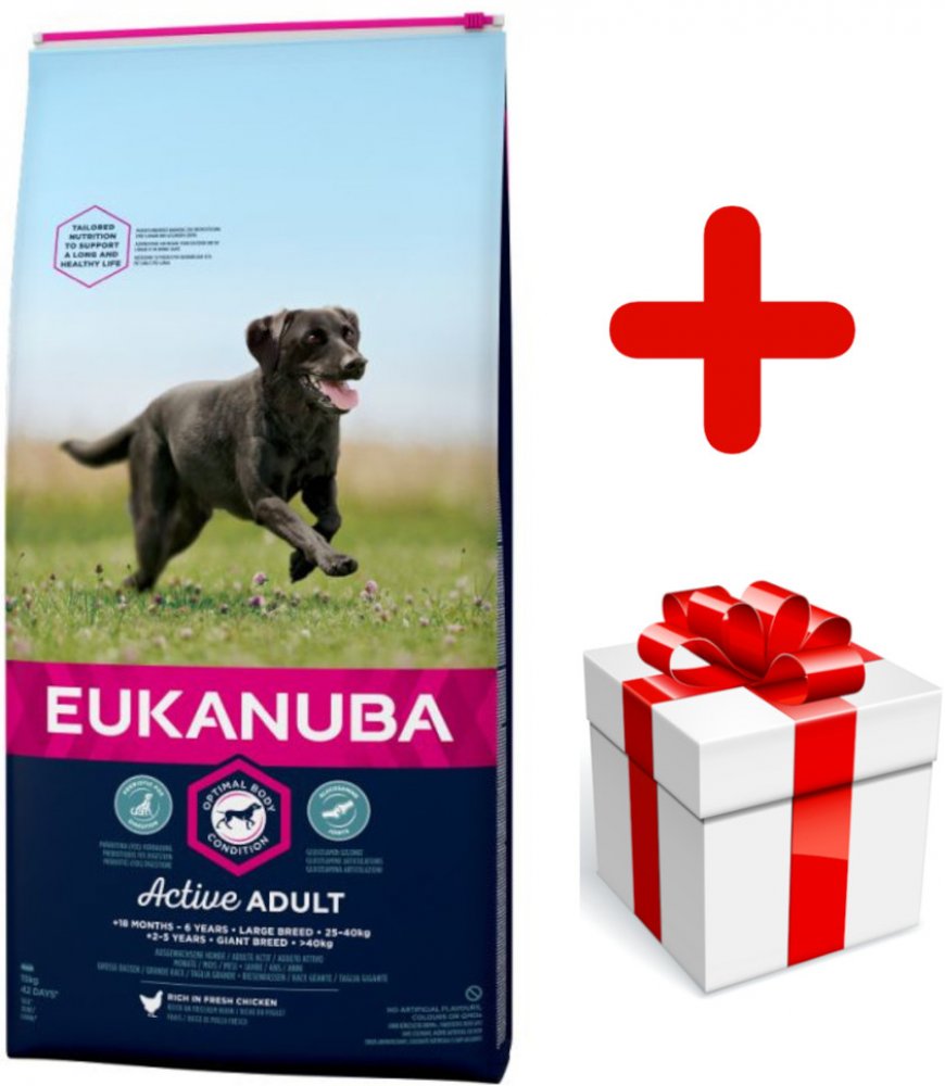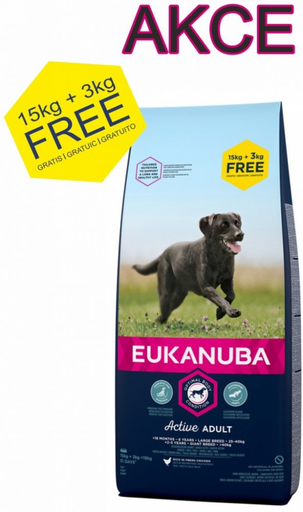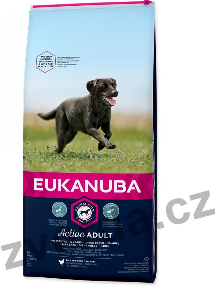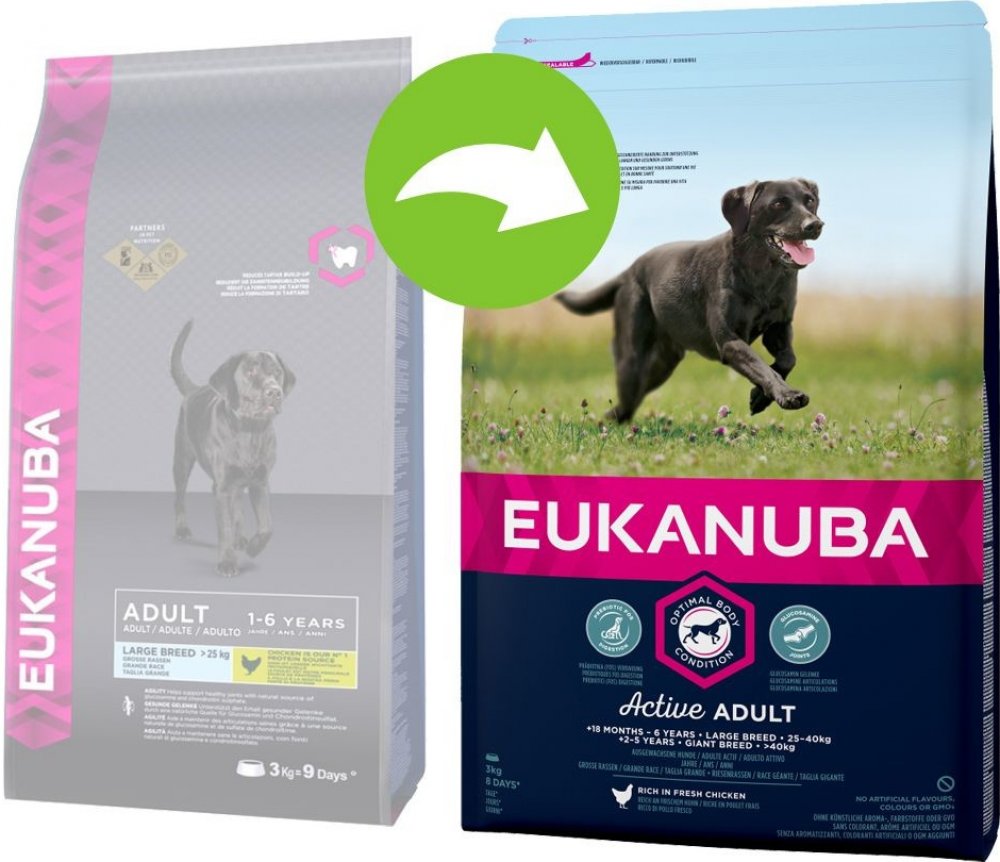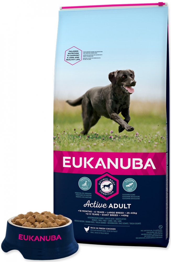 Nová EUKANUBA vylepšená receptura se zaměřením na konkrétní fázi života - pro velké aktivní dospělé psy od 18 měsíců do 6 let – poskytuje na míru upravenou výživu pro podporu štíhlých svalů a vyvážený příjem energie, které zajistí optimální tělesný stav vašeho dospělého psa. Naše jedinečná na míru upravená receptura pro velké dospělé psy obsahuje směs vlákniny, prebiotika FOS a řepné dužiny pro podporu zdravého zažívání, vápník a glukosamin pro zdravé kosti a klouby, přirozený zdroj mastných kyselin omega-6 a omega-3 pro zdravou kůži a srst, L-karnitin, který pomáhá s udržením váhy a antioxidanty, vitamin E pro podporu imunitního systému. Naše unikátní granule ve tvaru šestiúhelníku s přídavkem DentaDefense také pomáhají s udržováním čistých a zdravých zubů. Pokročilá výživa pro velké dospělé psy se zaměřením na podporu optimálního tělesného stavu a celoživotní pohodu.