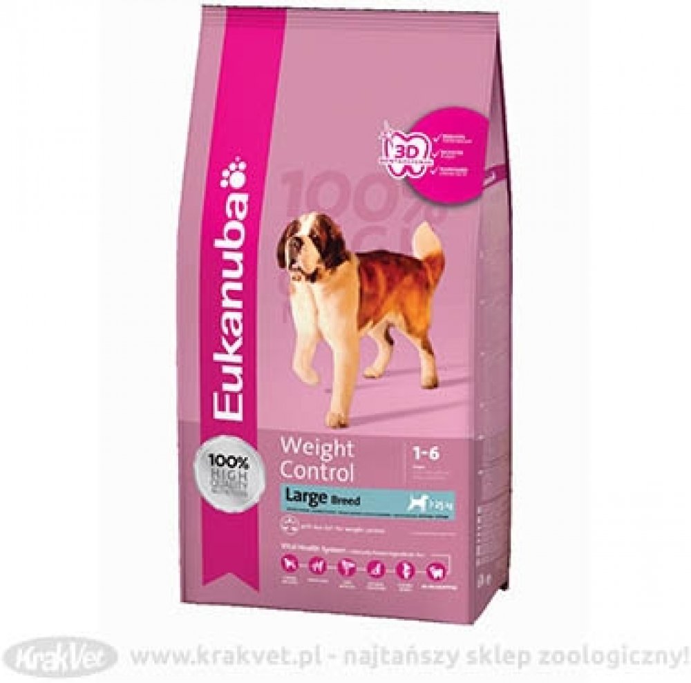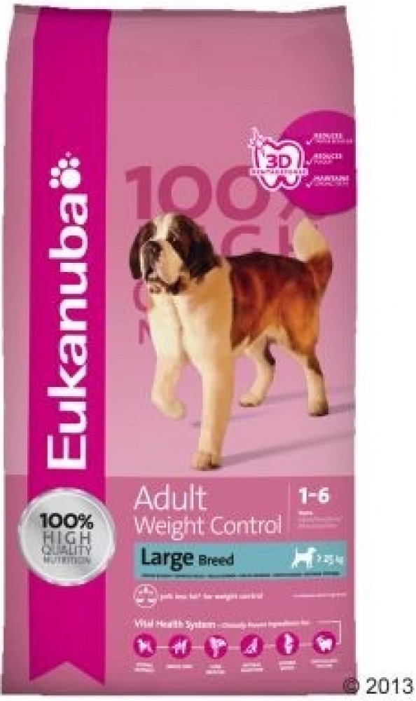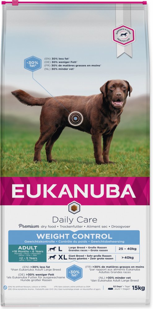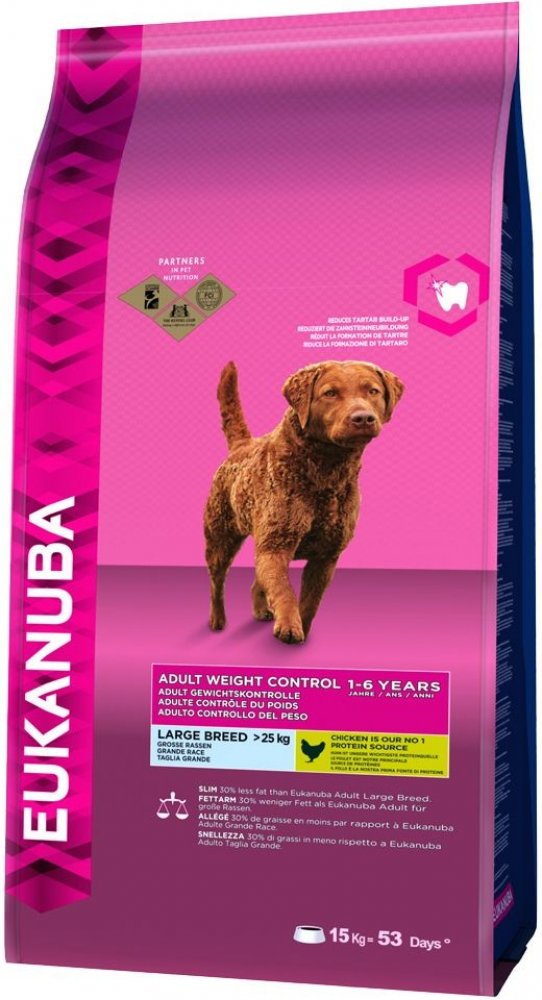 Nezáleží na tom, zda je příčinou nadváhy nedostatek pohybu, kastrace nebo genetické předpoklady: Speciální krmivo Eukanuba Adult Weight Control Large Breed Kuřecí napomáhá díky vysokému obsahu kvalitních bílkovin z kuřecího masa a sníženému množství tuku odstraňovat tukové polštáře a budovat silné a štíhlé svalstvo. Glukosamin a chondroitinsulfát navíc přispívají k dobré kondici kloubů a chrupavek. Krmivo obsahuje o 30% méně tuku než běžná krmiva a díky vyvážené kombinaci živin je ideální stravou pro obézní psy velkých plemen jako je zlatý retrívr, rottwailer nebo labrador. Prebiotika a řepné řízky stabilizují střevní mikroflóru a usnadňují vstřebávání důležitých látek. Granule DentaDefense čistí při žvýkání chrup a snižují tak tvorbu zubního plaku i kamene až o 80%. 10-letá pozorování značky Eukanuba prokázala, že se psi mohou dožít nadprůměrného věku! Váš čtyřnohý kamarád si zaslouží prožít dlouhý a plnohodnotný život. 10-letá pozorování značky Eukanuba prokázala, že krmiva značky Eukanuba umožňují psům prožít dlouhý život. Díky speciálnímu krmivu si budet užívat Vy i Váš pes společné chvíle po dlouhou dobu. Vlastnosti výrobku v krátkém přehledu: suché krmivo pro psy velkých plemen trpící nadváhou ve věku od 1 – 6 let a s hmotností nad 25 kg 100% kompletní a vyvážené – vyvinuto ve spolupráci s veterináři kuřecí maso jako hlavní složka: lehce stravitelné, kvalitní bílkoviny, které přispívají k budování a udržení štíhlého a silného svalstva snížené množství tuku: o 30% tuku méně než běžná krmiva L-karnitin: povzbuzuje látkovou výměnu a napomáhá redukovat zásoby tuku v těle zdravá kůže a srst: velké množství omega-3 a omega-6 mastných kyselin prokazatelně snižuje vypadávání srsti až o 80% a zvyšuje lesk srsti DentaDefensepro zdravý chrup: odborníci z Oral B vyvinuli speciální 3D granule, které napomáhají odstraňovat zubní plak a díky čistícím mikrokristalům snižují tvorbu zubního kamene až o 80% zdravé klouby: krmivo napomáhá udržovat ideální hmotnost a snižovat tak nadměrné zatížení kloubů, chondroitinsulfát a glukosamin přispívají k dobré kondici kloubů a chrupavek harmonické trávení: řepné řízky a prebiotika harmonizují trávení a stabilizují střevní mikroflóru s vápníkem: pro silné kosti a zdravý chrup obranyschopnost organismu: klinicky testované antioxidanty přispívají k ochraně buněk bez umělých barviv a ochucovadel