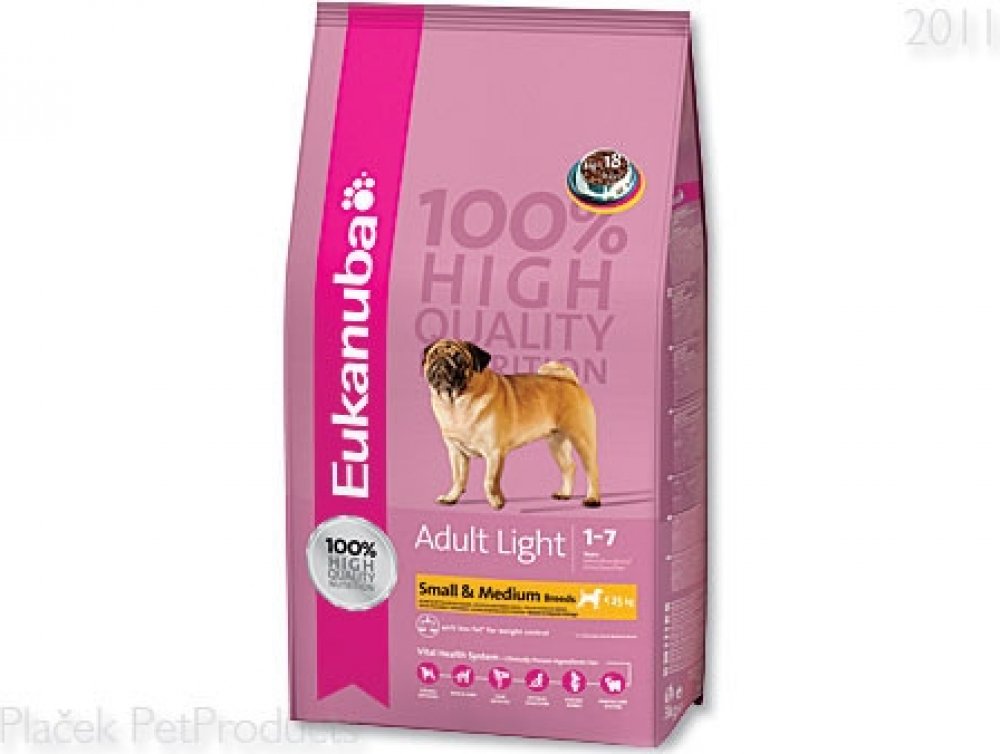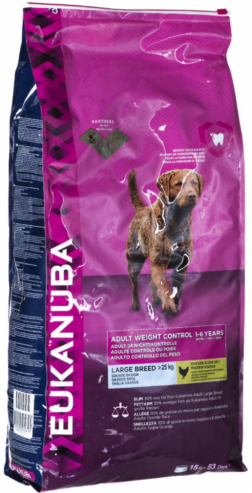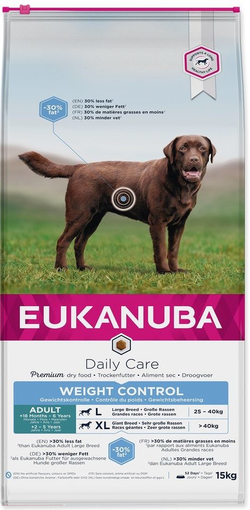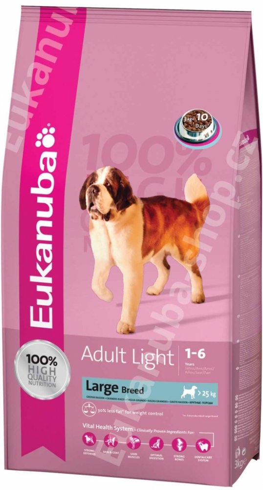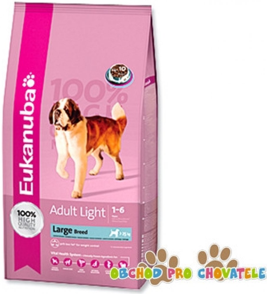 Eukanuba Adult Large Light 15kg + BATOH ZDARMA - Kompletní a vyvážené krmivo pro velká plemena od 1 až 2 let v závislosti na váze. Vhodné ke snížení váhy psa nebo pro psy s malou aktivitou. - Kompletní krmivo pro dospělé psy s nadváhou. Pro velká plemena s váhou od 26 do 40 kg je vhodné od 1 roku, pro obří plemena s váhou nad 40 kg podávejte toto krmivo od 2 let věku. Speciální krmivo určené k bez...