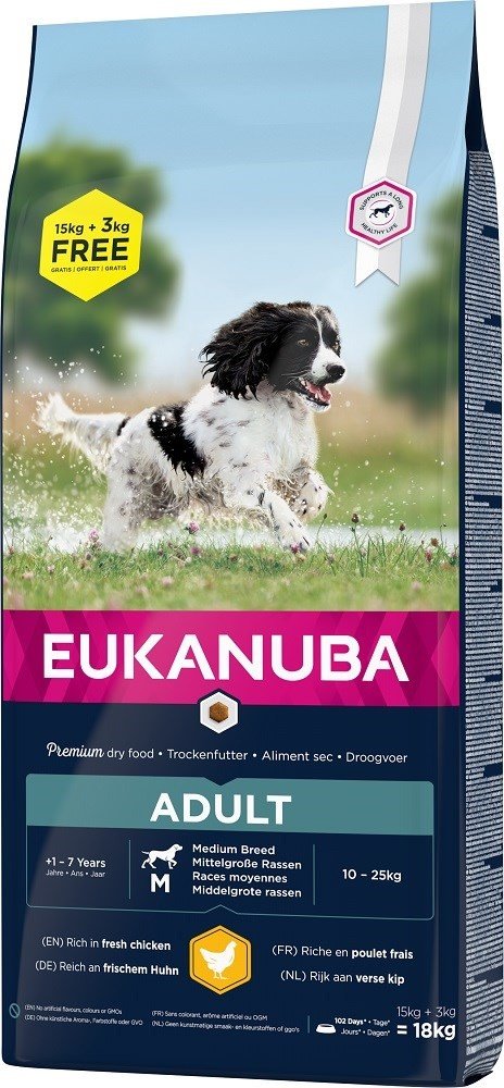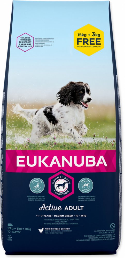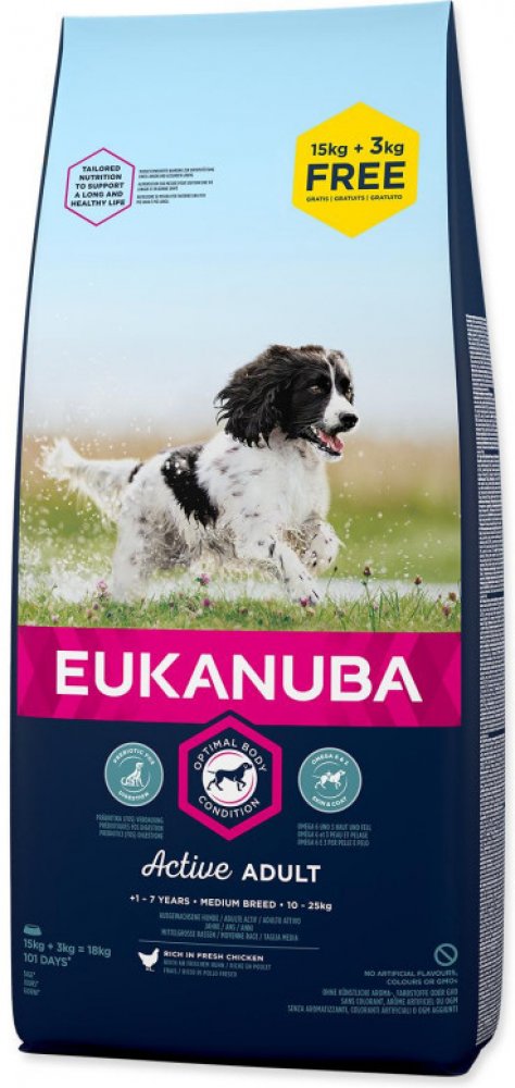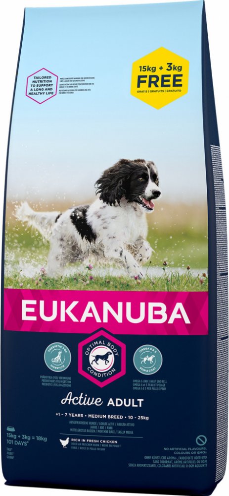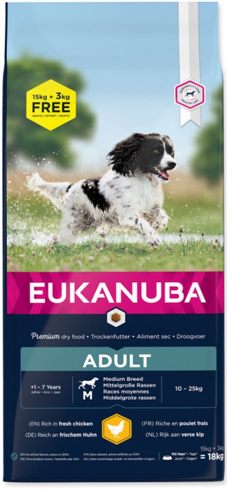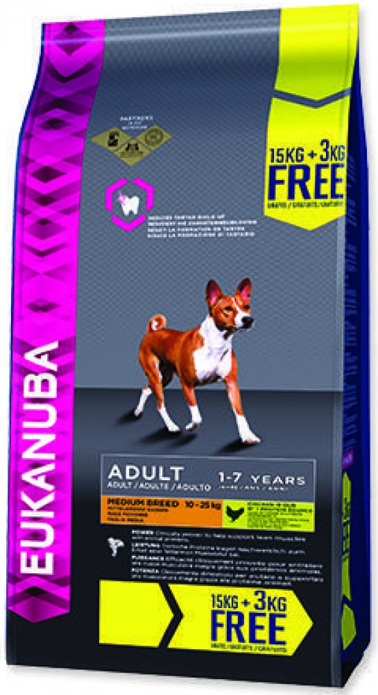 Eukanuba pro dospělé pro střední plemena s běžnou aktivitou kuřecí Eukanuba 18 kg superprémiové suché tvrdé Adult Medium Breed 27 % obiloviny z Nizozemska střední (200-500mg) 15 % 2.8 % 1.4 % 1.2 % 6.2 % 0.34 % vysoká středně (25-40%) standardní základní pasivní (prebiotika) možné částečná (země výroby)