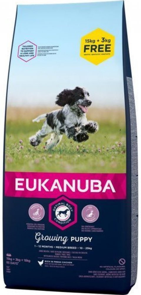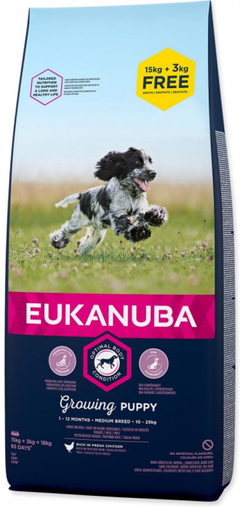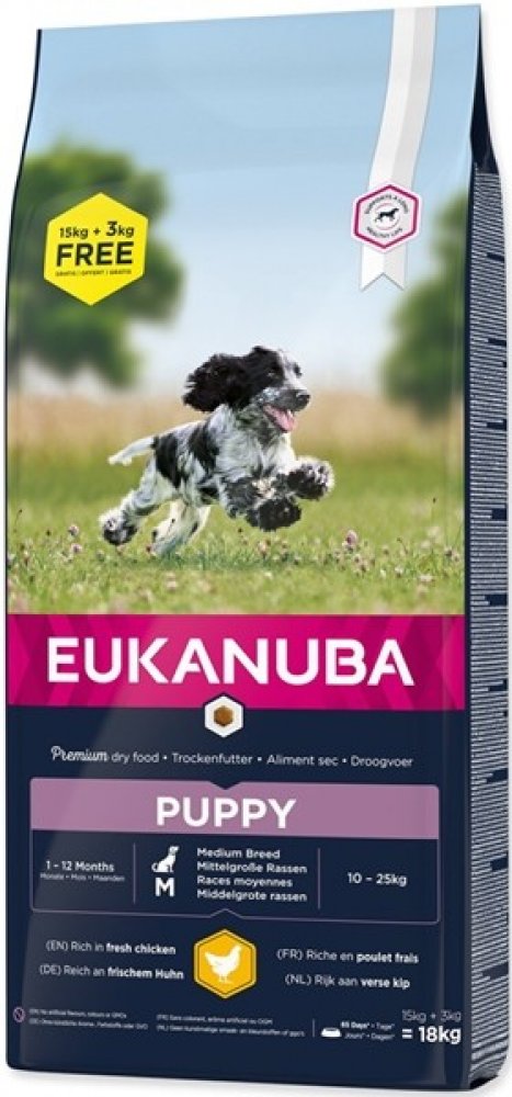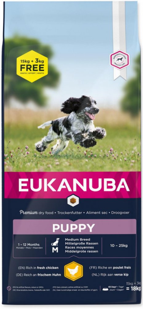 Naše jedinečná na míru upravená receptura pro štěňata středně velkých plemen obsahuje DHA, díky které se štěňata rychleji učí a snáze se cvičí, směs vlákniny, prebiotika FOS a řepné dužiny pro podporu zdravého zažívání, vápník pro zdravý růst kostí a přirozený zdroj mastných kyselin omega-6 a omega-3 pro zdravou kůži a srst.