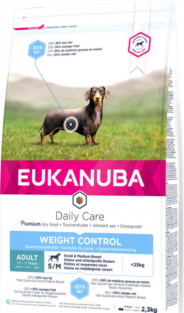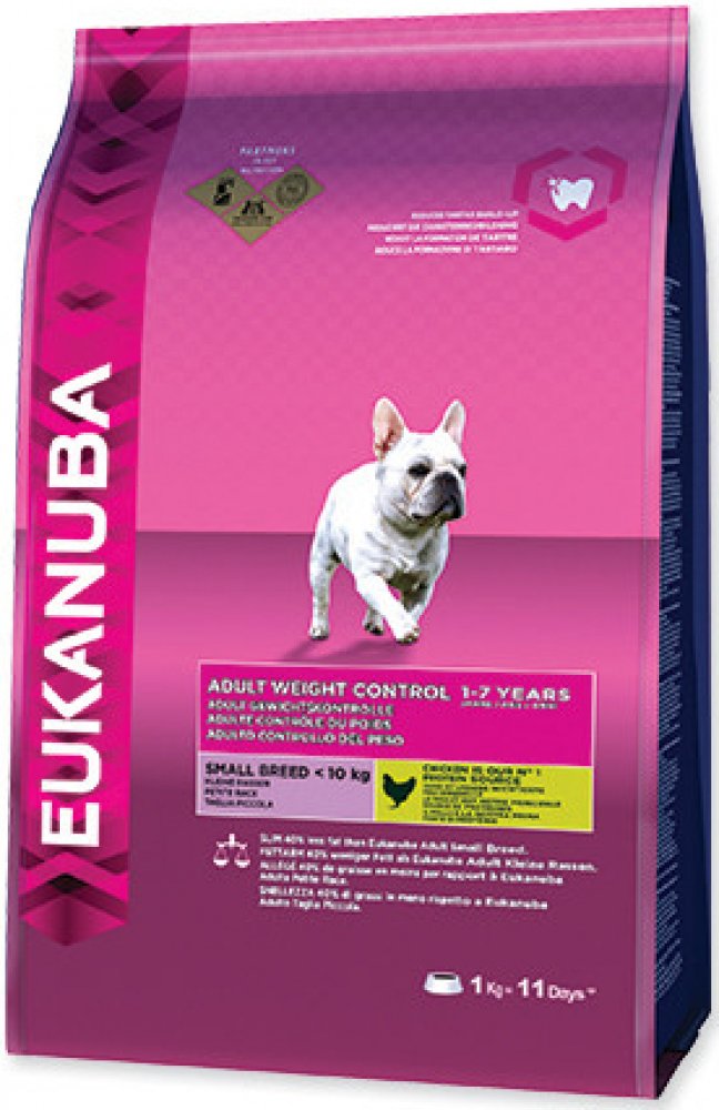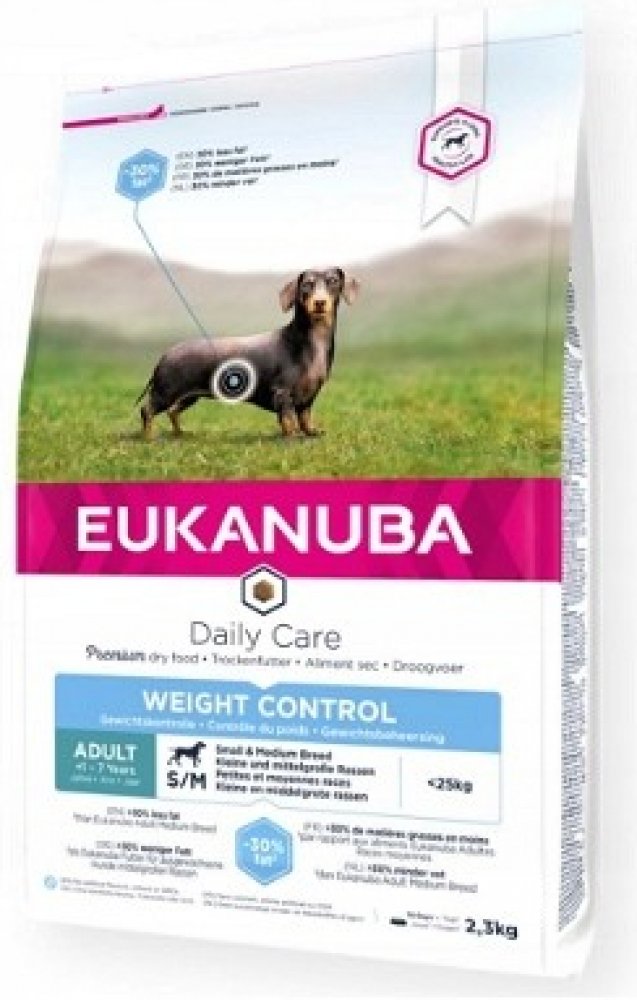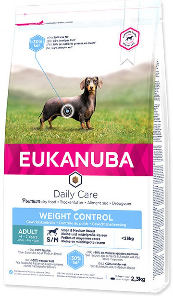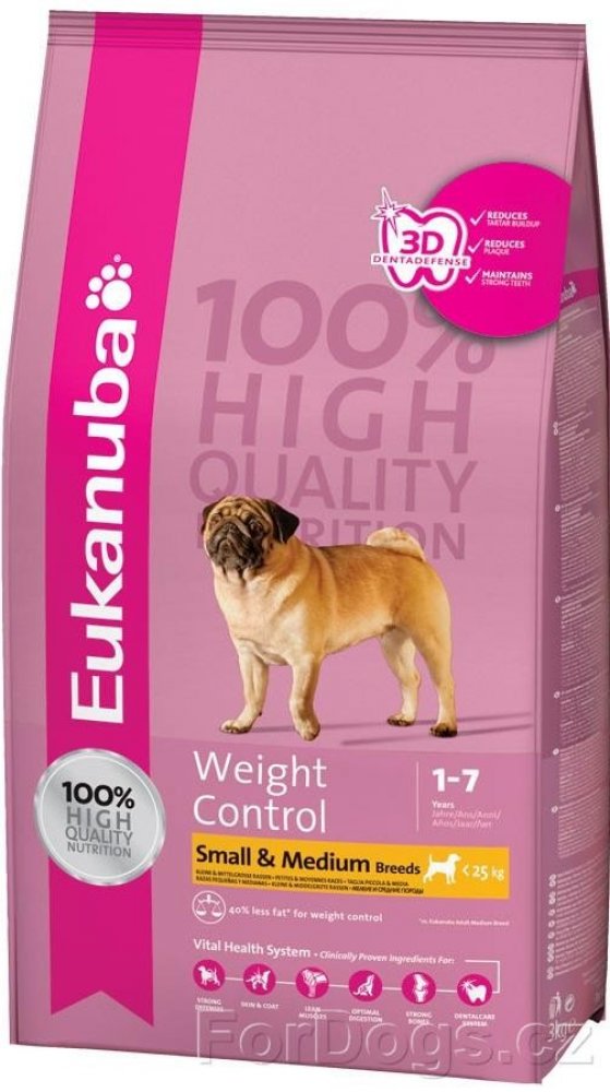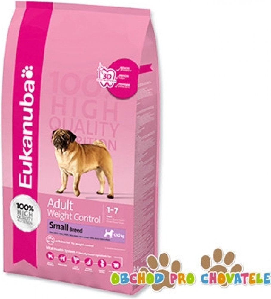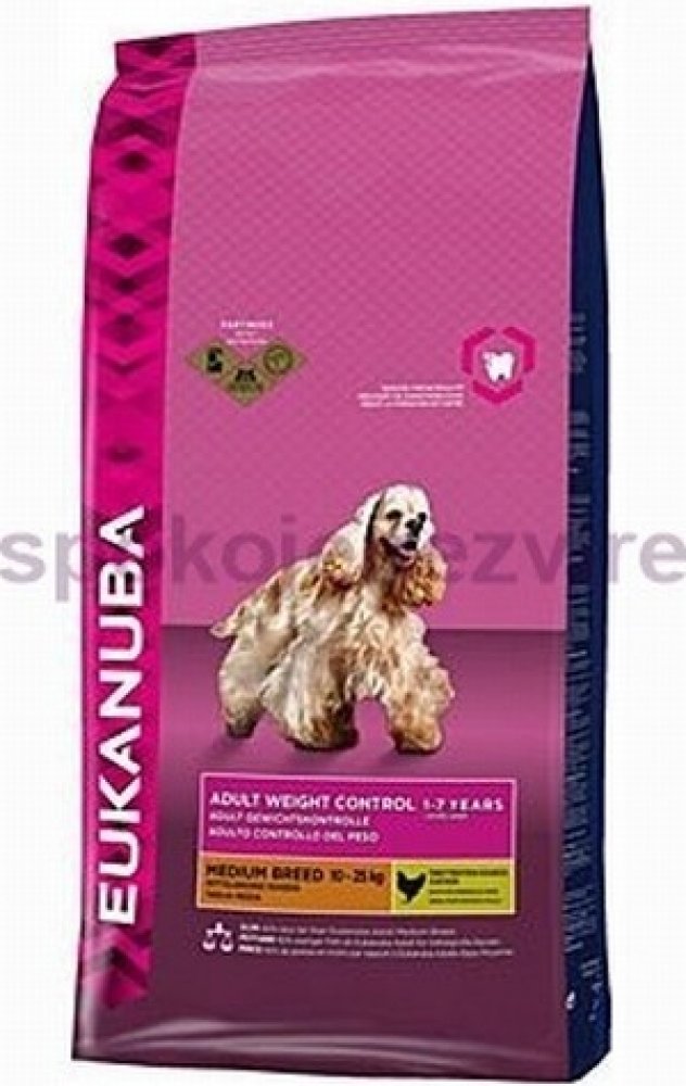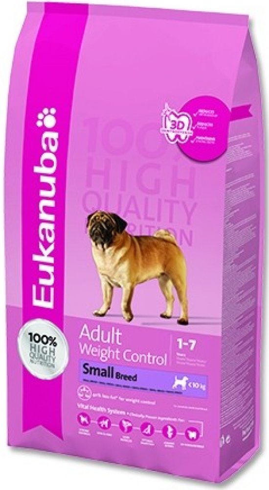 Toto krmivo Eukanuba obsahuje nižší množství tuku a poskytuje optimální denní dávku proteinů, karbohydrátů, důležitých vitamínů a minerálů pro zdraví a pohodu vašeho psa. Některé tuky byly nahrazeny karbohydráty s nižším obsahem kalorií, aniž by došlo ke ztrátě výživové hodnoty. Obsahuje přísady vysoké kvality a velké množství živočišných proteinů. 100% kompletní a vyvážená strava pro dospělé psy malých a středně velkých plemen, kteří mají nadváhu nebo jsou méně aktivní.