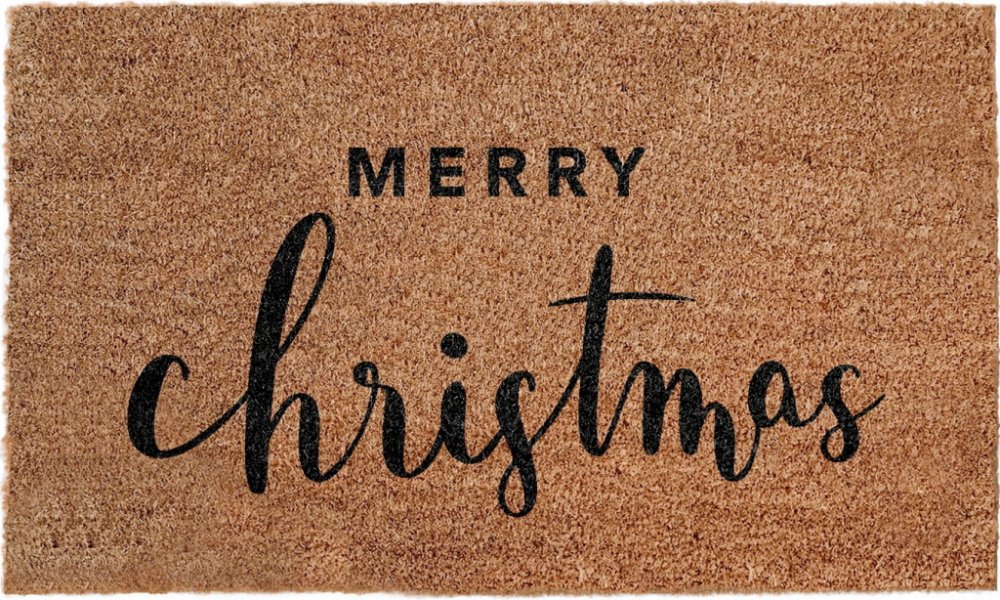 Přírodní kokosová vlákna zdobí vánoční nápis Merry Christmas zachycený kaligrafickým fontem. Návštěvu přivítá s láskou a osobitým stylem. Rohožka udrží čistotu vstupního prostoru a může být i odkládacím místem na znečištěnou obuv.