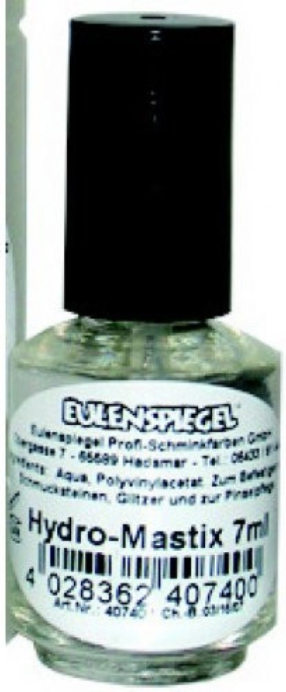 Lepidlo HYDRO-MASTIX 7 ml Eulenspiegel HYDRO-MASTIX je speciální lepidlo pro lepení malých předmětů přímo na kůži, můžete ho použít k přilepení bradavic, krátkých vousů, kamínků atd.. Můžete ho také použít k navrácení tvarů již použitých štětců - po důkladném očištění štětce ho vysuště, zabalte do malého měkkého kousku papíru a vytvarujte, ponořte takto připravený štětec do hydro-mastixu. Takto "o...