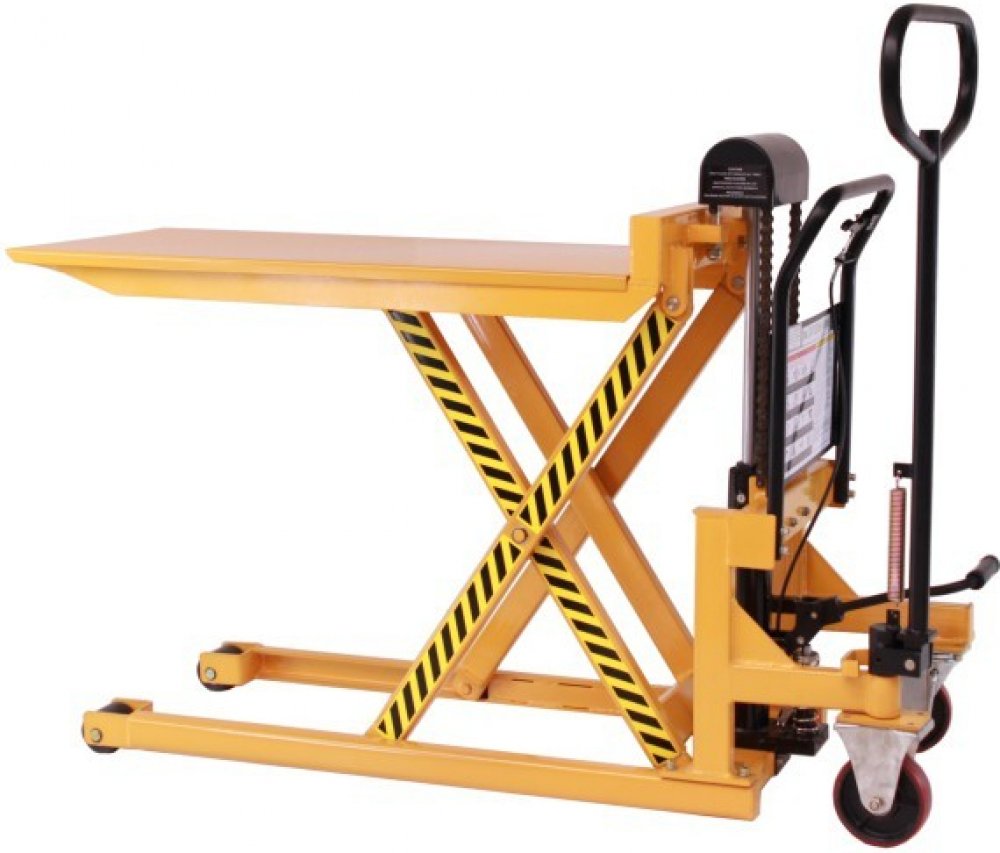 Lehce přemístí palety a zdvihne materiál o hmotnosti až 1000 kg do ergonomicky vyhovující polohy. Manipulace v prostoru se provádí tažením za oj. Zdvih se provádí pumpováním nožním pedálem. Spouštění jako u paletového vozíku - páčkou na ojce. Vozík je opatřen odnímatelnou plošinkou o rozměru 1115 x 538 mm.