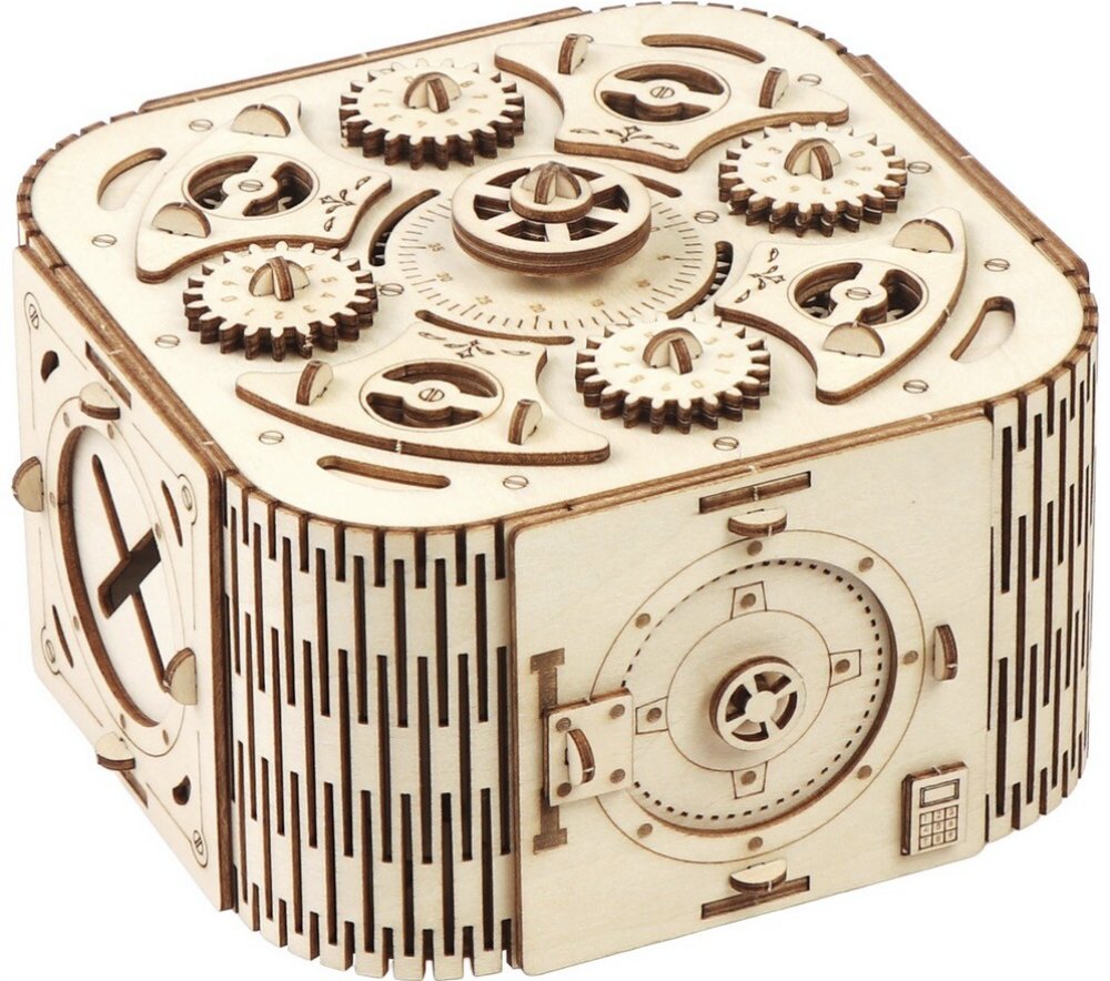 Geared Safe Box je fascinující 3D dřevěná stavebnice, která vás provede principy mechanického zabezpečení. Během stavby uvidíte, jak do sebe zapadají ozubená kola, která nakonec vytvoří funkční uzamykací mechanismus. Vše sestavíte bez jediného kapky lepidla nebo speciálního nářadí.