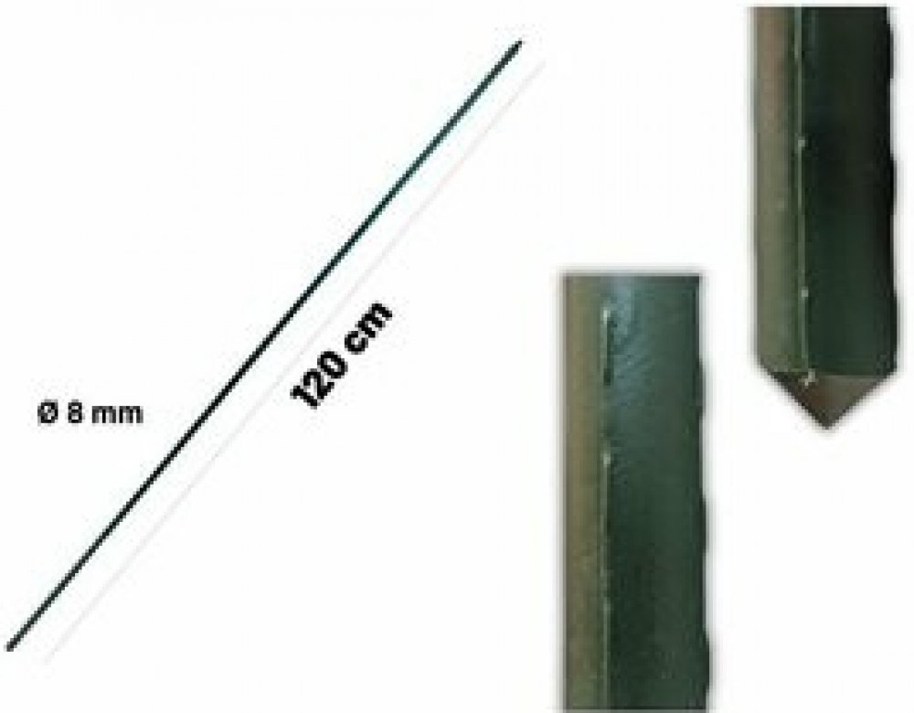 - Materiál: poplastovaná ocel - Délka: 120 cm - Průměr: 8 mm - Barva: zelená - Koncovka: špičatá pro snadné zapíchnutí do země