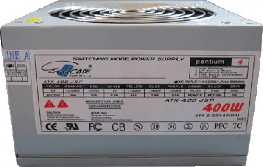 výkon 400 W. Zdroj je osazen 120mm ventilátorem a pasivním