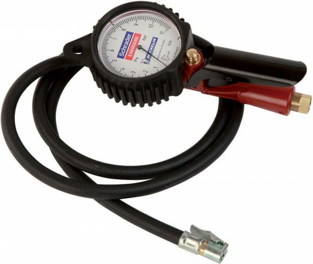 Hustič pneu s manometrem a protokolem výrobce o kalibraci.