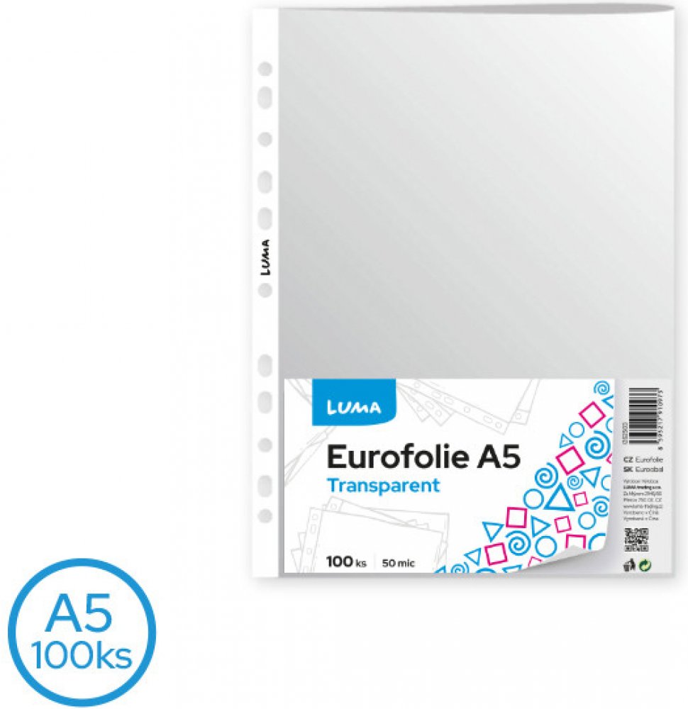 - obal formátu A5- 50mic polypropylenová fólie- transparentní- s eurozávěsem- umožňuje zakládání obalů s dokumenty do kroužkového i pákového pořadače- balení obsahuje 100ks