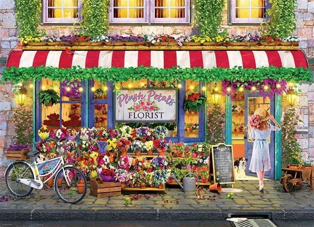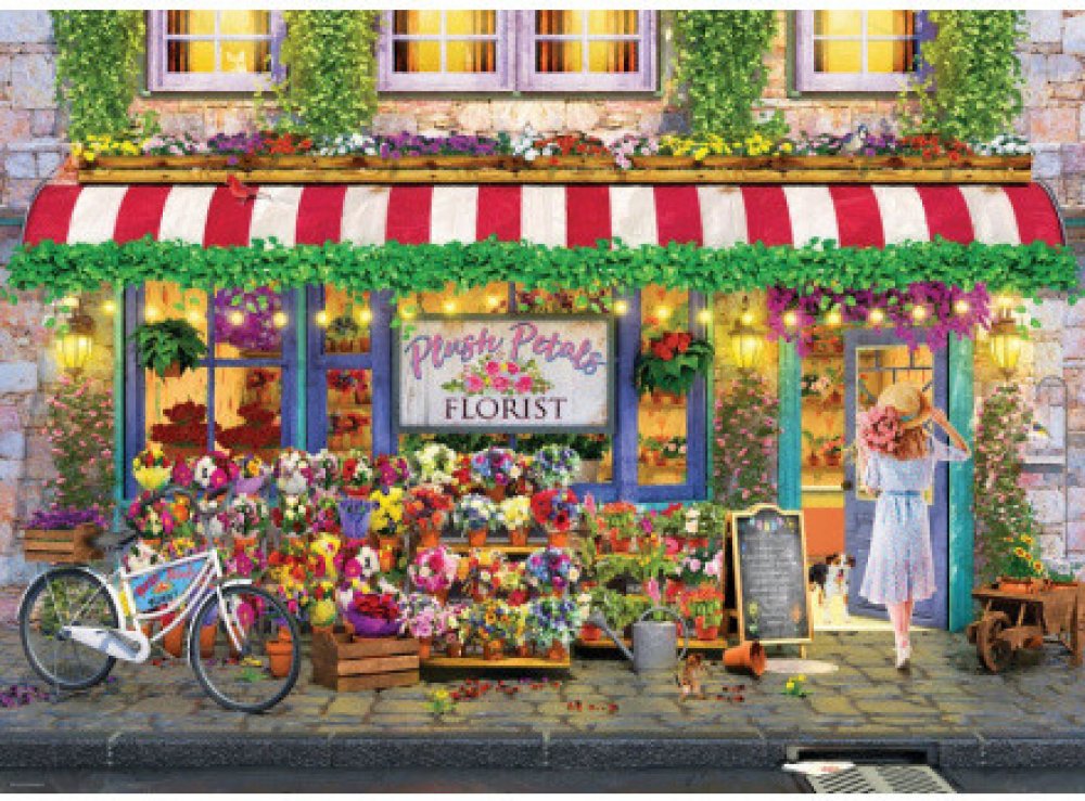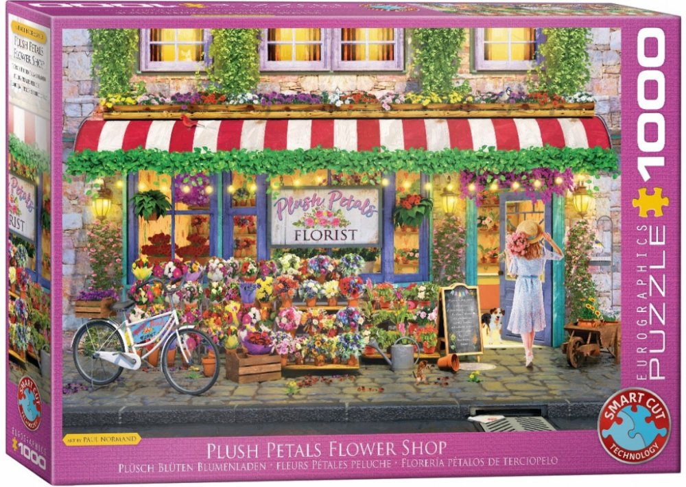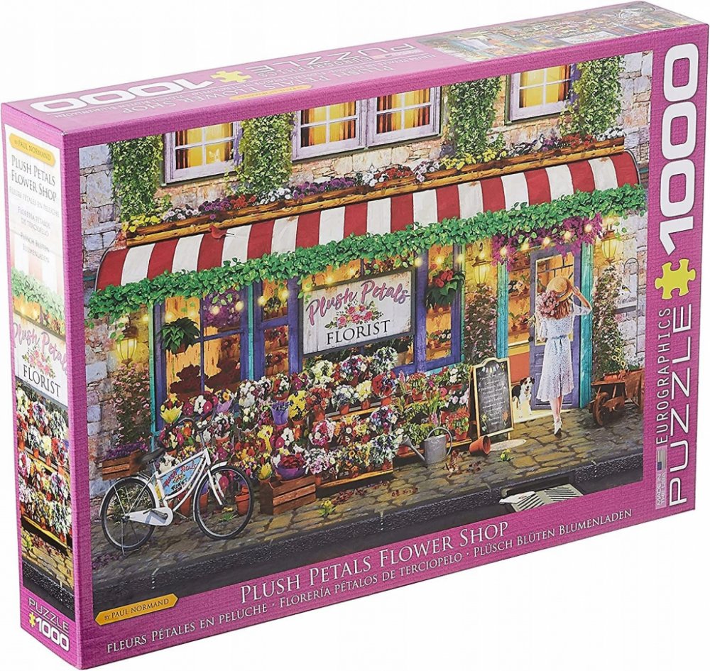 Puzzle od kanadského výrobce Eurographics v obdélníkovém tvaru s krásným motivem obrazu Květinářství Plus Petals, autorem je malíř Paul Normand. Na obrázku je zachycena výloha květinářství s mladou zákaznící, která právě schází dovnitř obchodu.Raznice puzzle Eurographics nekopíruje standardní mřížku, rohy a hrany dílků nejsou vždy v jedné ose a dílky mají neobvyklý tvar. Obtížnost puzzle je tak vyšší než u klasické mřížkové raznice, kterou používají přední výrobci v Evropě.