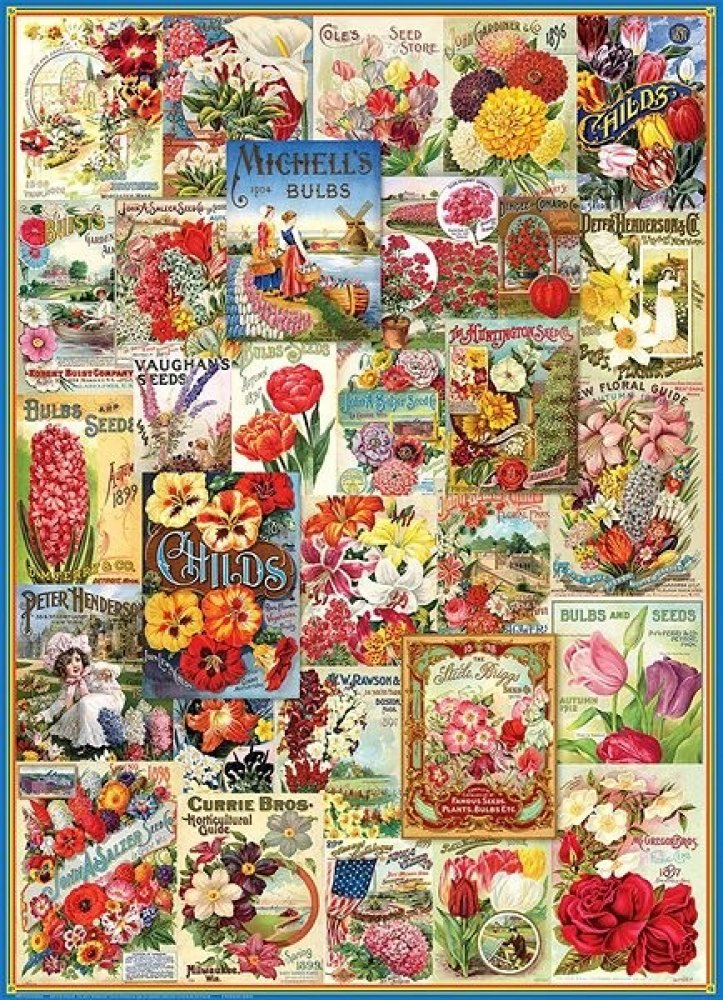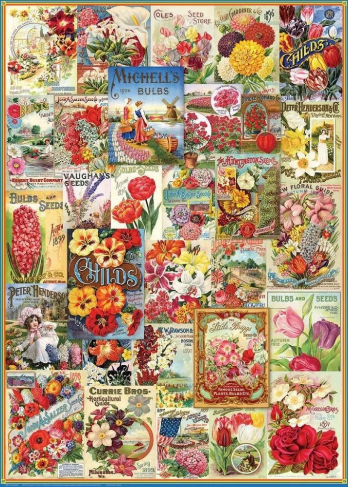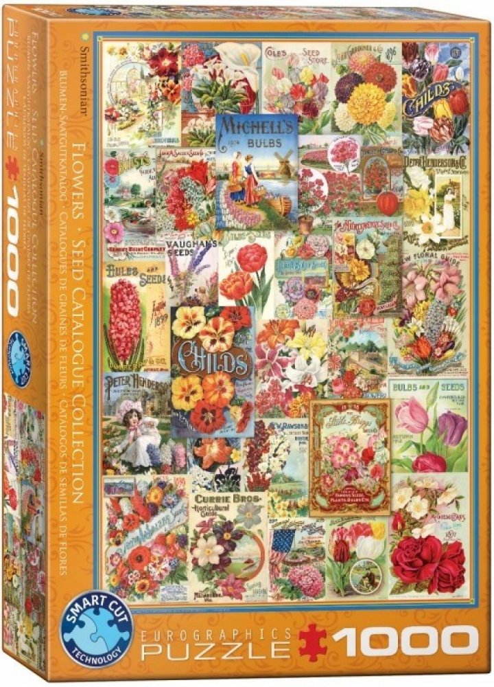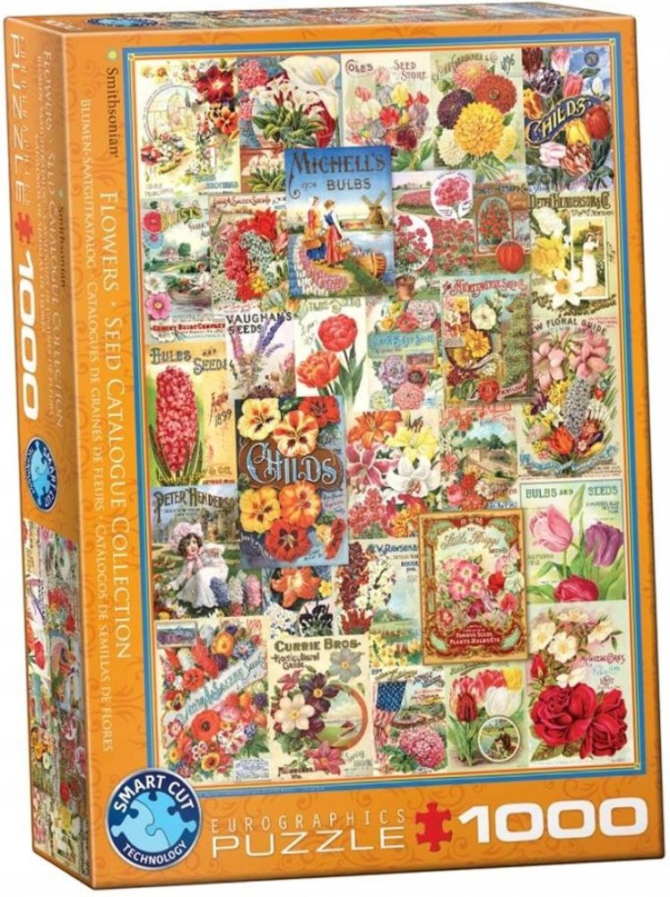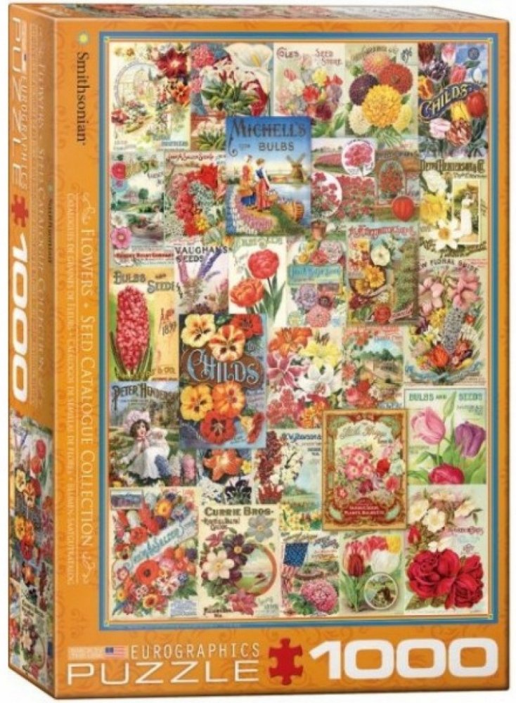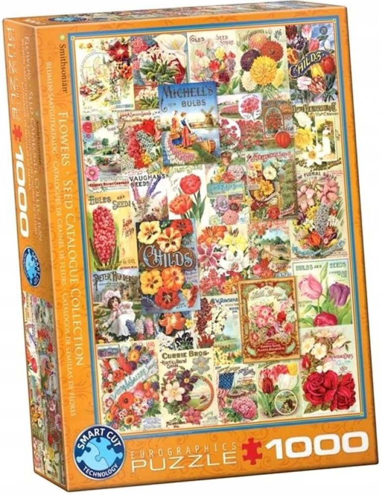Puzzle od kanadského výrobce Eurographics v obdélníkovém tvaru s krásným motivem Katalog semínek: Květiny. Na obrázku je koláž malovaných obalů semínek různých druhů květin.Raznice puzzle Eurographics nekopíruje standardní mřížku, rohy a hrany dílků nejsou vždy v jedné ose a dílky mají neobvyklý tvar. Obtížnost puzzle je tak vyšší než u klasické mřížkové raznice, kterou používají přední výrobci v Evropě.