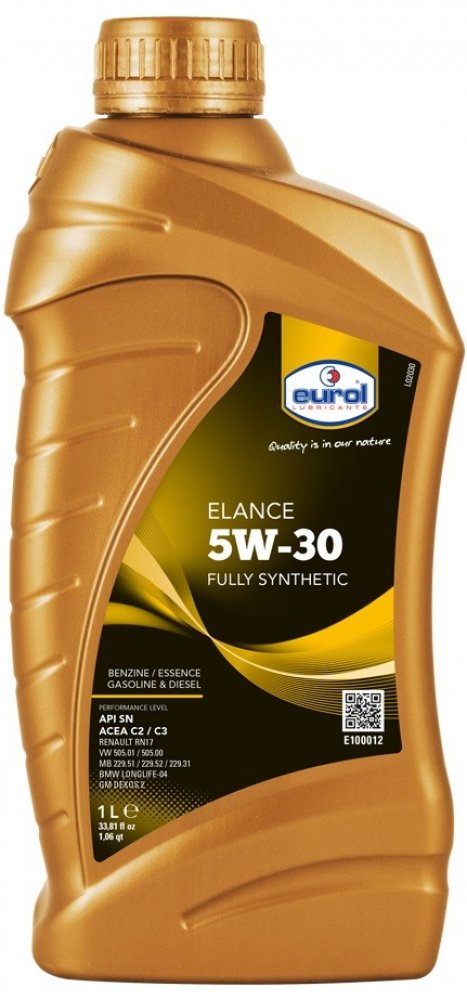 Eurol Elance 5W-30 je plně syntetický vysoce výkonný motorový olej pro benzinová a naftová vozidla. Eurol Elance 5W-30 má nízký obsah sulfátového popela a také nízké hladiny fosforu a síry (tzv. „mid-SAPS“ technologie). Eurol Elance 5W-30 splňuje požadavky Renault RN17 a lze jej použít i tam, kde jsou předepsány RN0700 a RN0710.