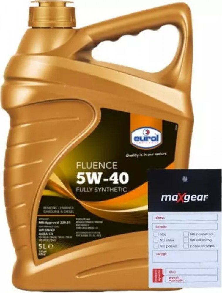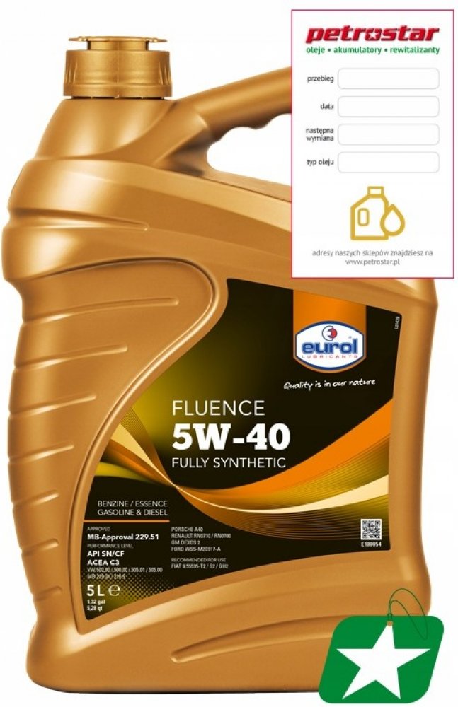 Eurol Fluence 5W-40, vyrobený s přísadami OPT Eurol, nabízí velmi vysokou ochranu během dlouhých intervalů výměny oleje. Doporučuje se zejména pro osobní automobily Euro-4 Mercedes Benz vyžadující použití olejů s normou MB 229.51, aby se zabránilo zablokování filtru sazí (DPF).
