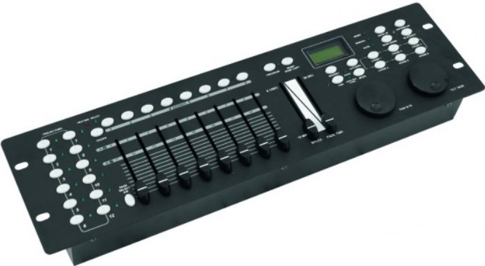 DMX ovladač pro 12 světelných efektů, každý s 20 DMX kanály. 240 programovatelných scén (30 bank x 8 scén). 6 chaserů s 240 scénami, manuální nebo časové nastavení, Blackout, podpora RDM, USB port.