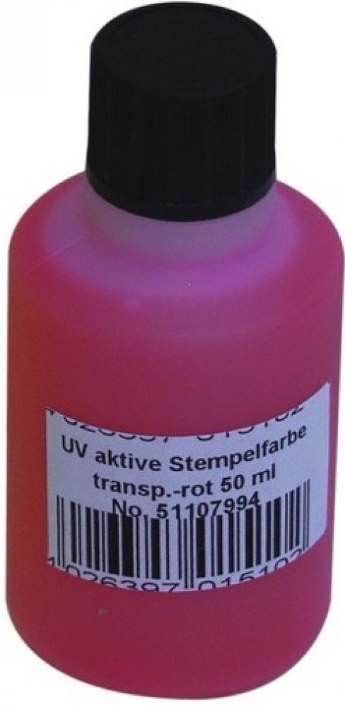 UV aktivní razítkovací barva, transparentní červená, 50ml. Vhodná pro označení návštěvníků u vstupu diskoték, tanečních klubů a jiných společenských akcí. Viditelná pouze pod UV světlem. Vyrobeno v Německu.Hmotnost: 0,05 kg