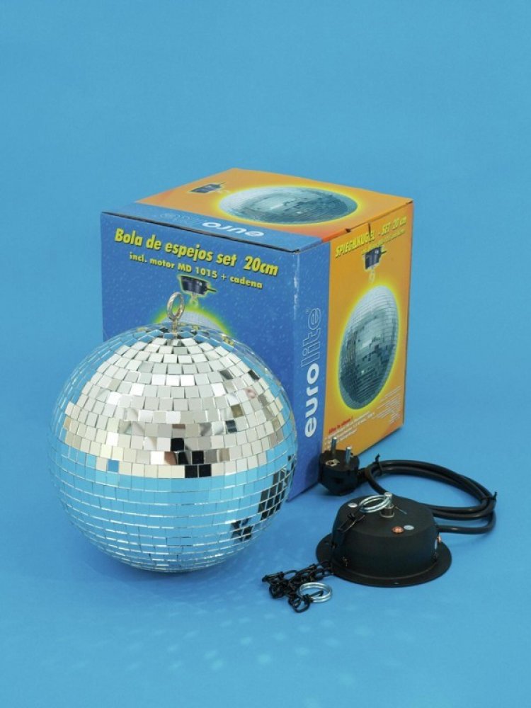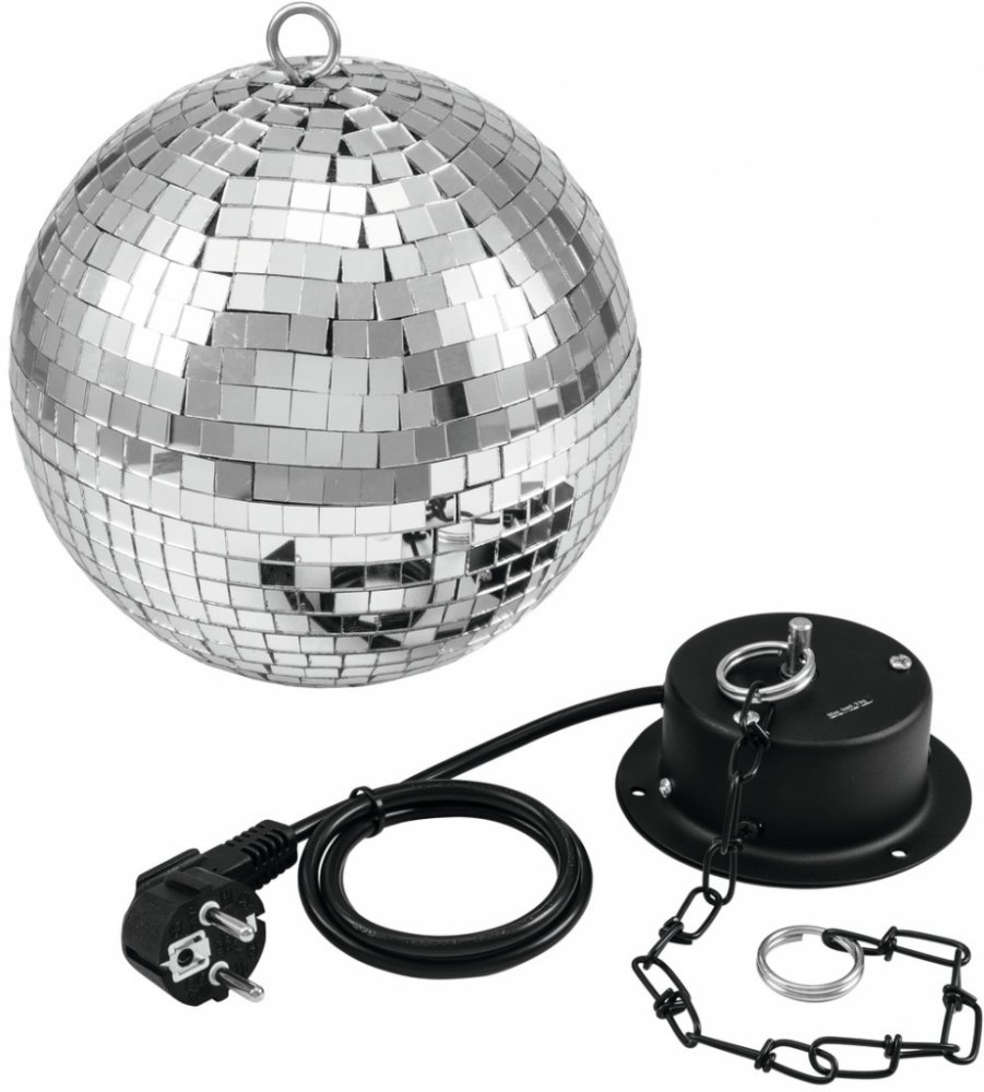 Sady obsahují zrcadlovou kouli v různých průměrech, motorek 1,5 otáčky/min. řetěz k upevnění koule. Ideální dekorace pro noční kluby, bary a restaurace.